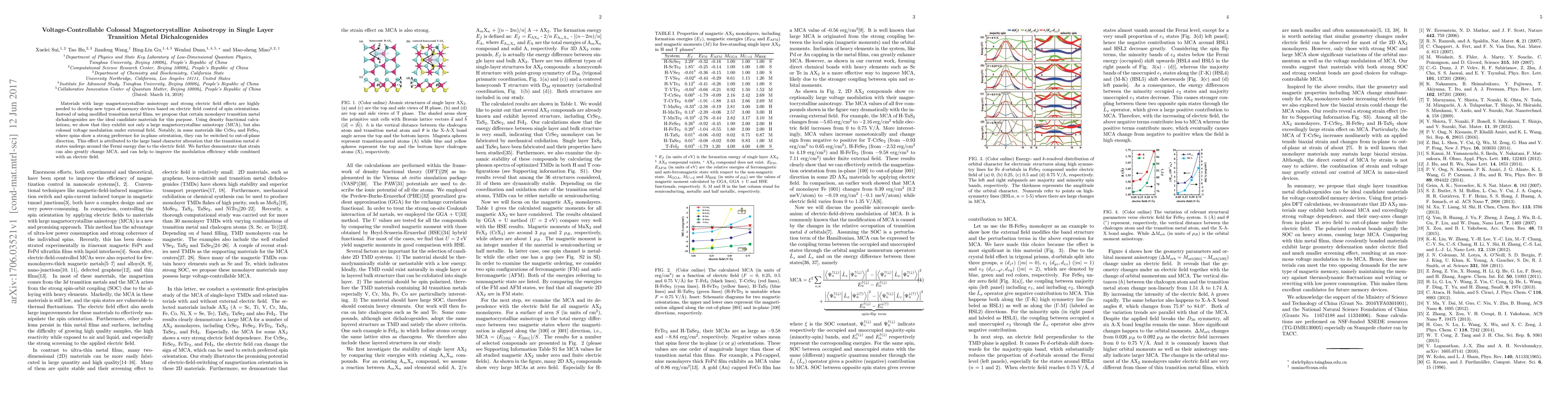 This research proposes monolayer transition metal dichalcogenides as ideal materials for electric field-controlled memory devices due to their large magnetocrystalline anisotropy and voltage-modulated spin orientation. Density functional calculations reveal colossal voltage modulation effects, particularly in CrSe_2 and FeSe_2, and suggest that strain can enhance modulation efficiency when combined with electric fields.