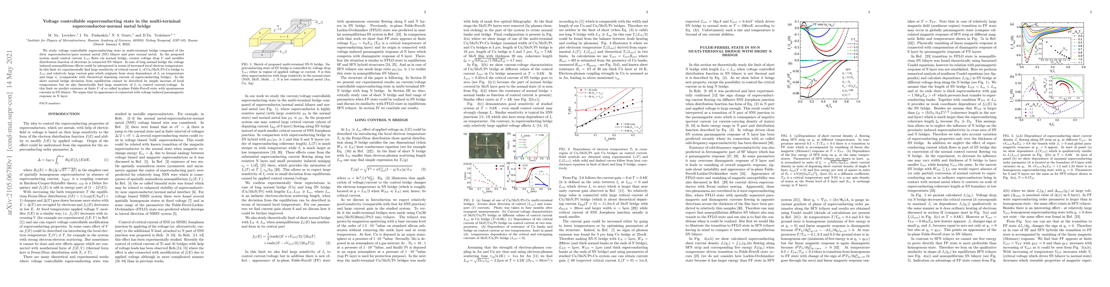 We study voltage controllable superconducting state in multi-terminal bridge composed of the dirty superconductor/pure normal metal (SN) bilayer and pure normal metal. In the proposed system small control current $I_{ctrl}$ flows via normal bridge, creates voltage drop $V$ and modifies distribution function of electrons in connected SN bilayer. In case of long normal bridge the voltage induced nonequilibrium effects could be interpreted in terms of increased local electron temperature. In this limit we experimentally find large sensitivity of critical curent $I_c$ of Cu/MoN/Pt-Cu bridge to $I_{ctrl}$ and relatively large current gain which originate from steep dependence of $I_c$ on temperature and large $I_c$ (comparable with theoretical depairing current of superconducting bridge). In the short normal bridge deviation from equilibrium cannot be described by simple increase of local temperature but we also theoretically find large sensitivity of $I_c$ to control current/voltage. In this limit we predict existence at finite $V$ of so called in-plane Fulde-Ferrell state with spontaneous currents in SN bilayer. We argue that its appearance is connected with voltage induced paramagnetic response in N layer.
