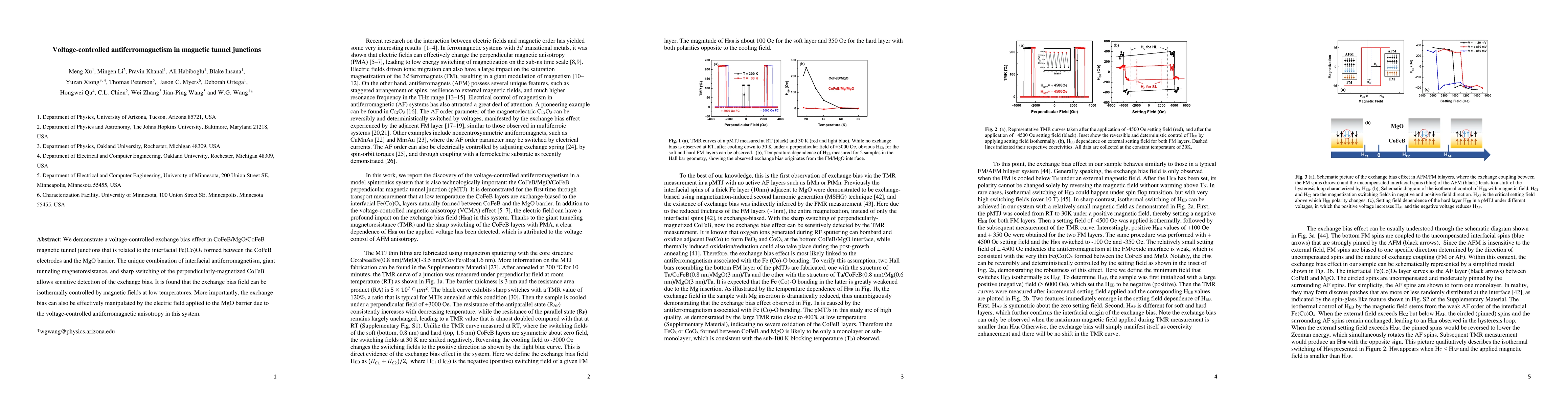 This paper demonstrates voltage-controlled exchange bias in CoFeB/MgO/CoFeB magnetic tunnel junctions via interfacial Fe(Co)Ox, showcasing giant tunneling magnetoresistance and sharp switching. The exchange bias can be manipulated by both magnetic fields and electric fields applied to the MgO barrier, highlighting voltage-controlled antiferromagnetic anisotropy.