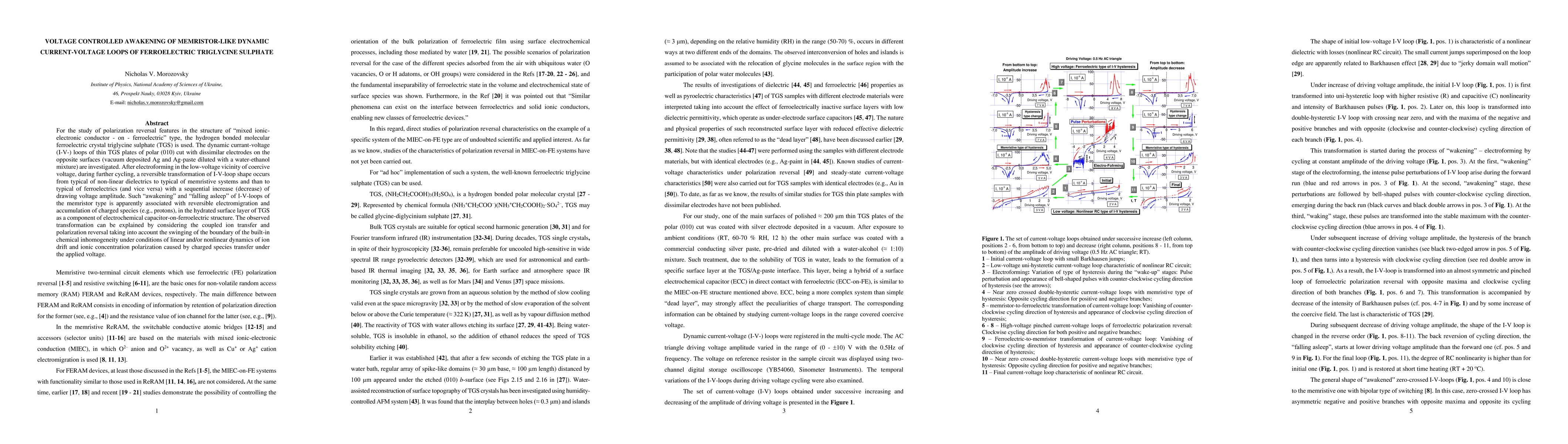 For the study of polarization reversal features in the structure of "mixed ionic-electronic conductor - on - ferroelectric" type, the hydrogen bonded molecular ferroelectric crystal triglycine sulphate (TGS) is used. The dynamic currant-voltage (I-V-) loops of thin TGS plates of polar (010) cut with dissimilar electrodes on the opposite surfaces (vacuum deposited Ag and Ag-paste diluted with a water-ethanol mixture) are investigated. After electroforming in the low-voltage vicinity of coercive voltage, during further cycling, a reversible transformation of I-V-loop shape occurs from typical of non-linear dielectrics to typical of memristive systems and than to typical of ferroelectrics (and vice versa) with a sequential increase (decrease) of drawing voltage amplitude. Such "awakening" and "falling asleep" of I-V-loops of the memristor type is apparently associated with reversible electromigration and accumulation of charged species (e.g., protons), in the hydrated surface layer of TGS as a component of electrochemical capacitor-on-ferroelectric structure. The observed transformation can be explained by considering the coupled ion transfer and polarization reversal taking into account the swinging of the boundary of the built-in chemical inhomogeneity under conditions of linear and/or nonlinear dynamics of ion drift and ionic concentration polarization caused by charged species transfer under the applied voltage.