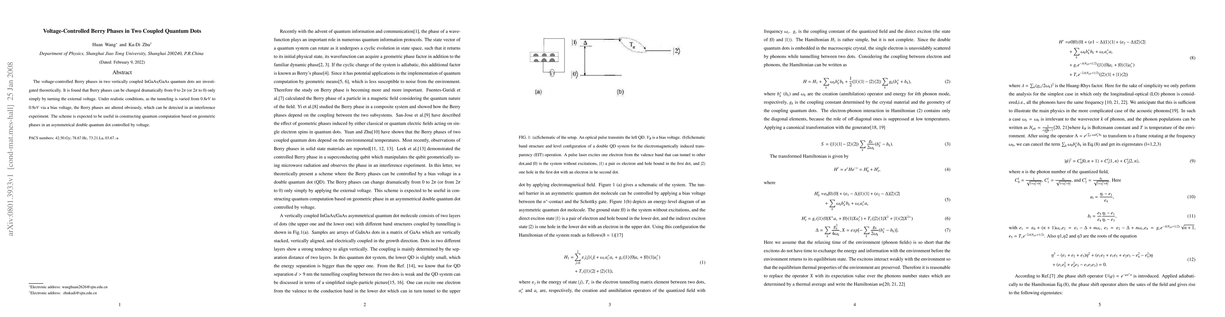 This paper investigates how voltage control can significantly alter Berry phases in two coupled InGaAs/GaAs quantum dots, transforming them from 0 to 2$\pi$ (or vice versa) through external bias. This voltage-induced change in Berry phases, observable via tunneling variations, holds potential for developing voltage-controlled quantum computation based on geometric phases.