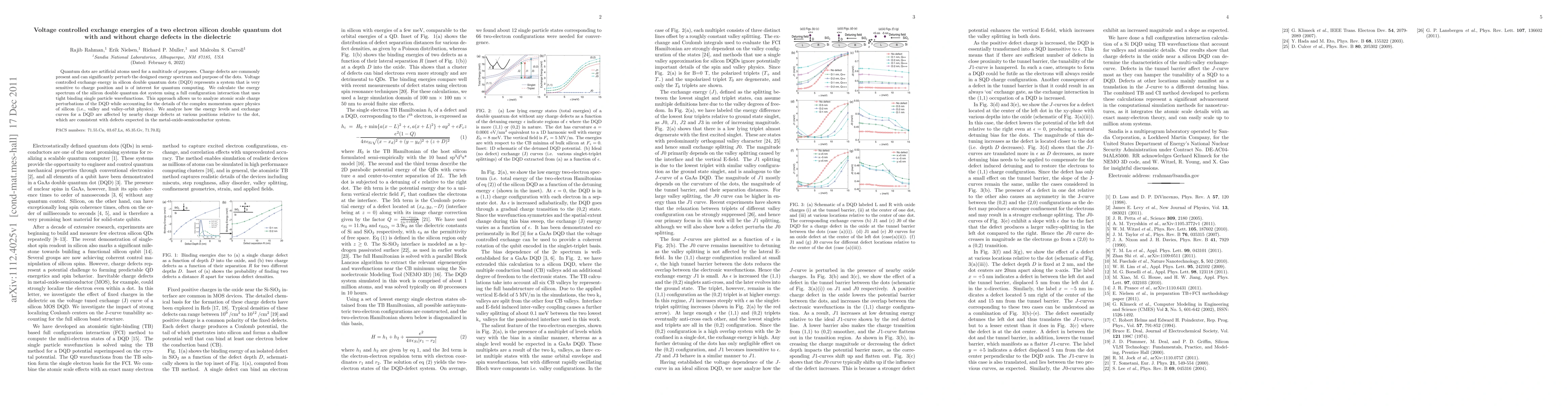Quantum dots are artificial atoms used for a multitude of purposes. Charge defects are commonly present and can significantly perturb the designed energy spectrum and purpose of the dots. Voltage controlled exchange energy in silicon double quantum dots (DQD) represents a system that is very sensitive to charge position and is of interest for quantum computing. We calculate the energy spectrum of the silicon double quantum dot system using a full configuration interaction that uses tight binding single particle wavefunctions. This approach allows us to analyze atomic scale charge perturbations of the DQD while accounting for the details of the complex momentum space physics of silicon (i.e., valley and valley-orbit physics). We analyze how the energy levels and exchange curves for a DQD are affected by nearby charge defects at various positions relative to the dot, which are consistent with defects expected in the metal-oxide-semiconductor system.