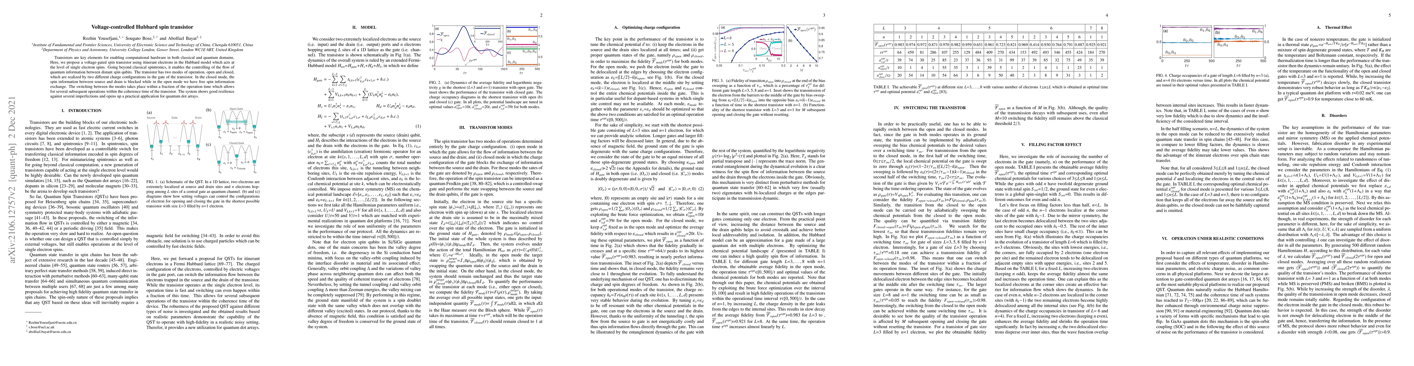 This paper proposes a voltage-controlled spin transistor based on the Hubbard model, enabling the regulation of quantum information flow between distant spin qubits. The transistor operates in open and closed modes, allowing for rapid switching and resilience against imperfections, thus promising practical applications in quantum dot arrays.