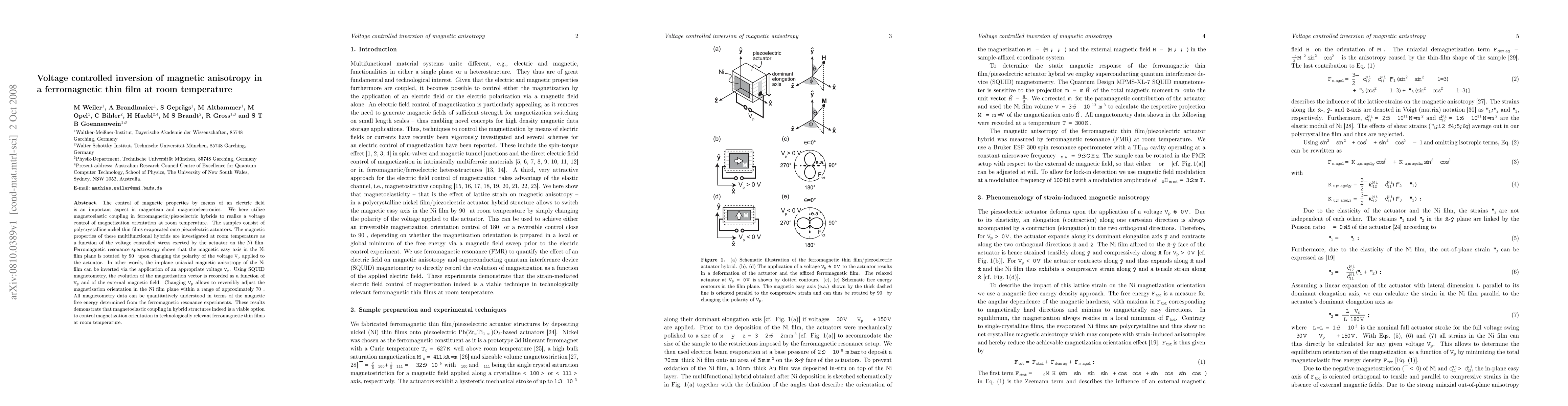 This paper demonstrates voltage-controlled inversion of magnetic anisotropy in ferromagnetic nickel thin films via magnetoelastic coupling with piezoelectric actuators at room temperature. The study shows that the magnetization orientation can be reversibly adjusted by changing the applied voltage, highlighting the potential of hybrid structures for magnetoelectronics.