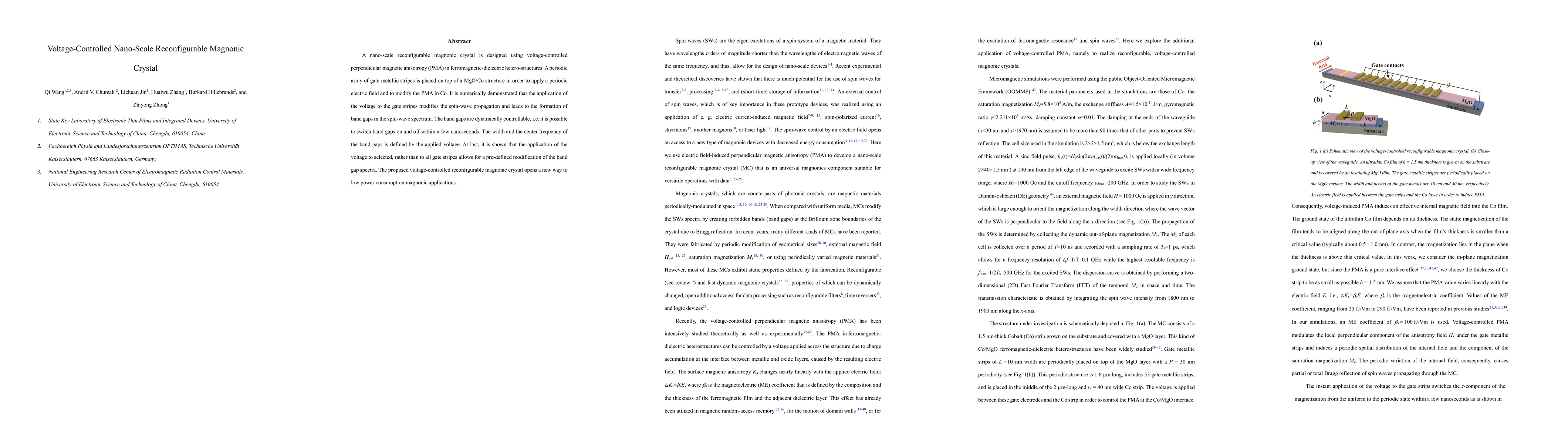 A nano-scale reconfigurable magnonic crystal using voltage-controlled perpendicular magnetic anisotropy is demonstrated. Applying voltage to gate stripes on a MgO/Co structure dynamically controls spin-wave propagation, creating and switching band gaps within nanoseconds, offering low power magnonic applications.