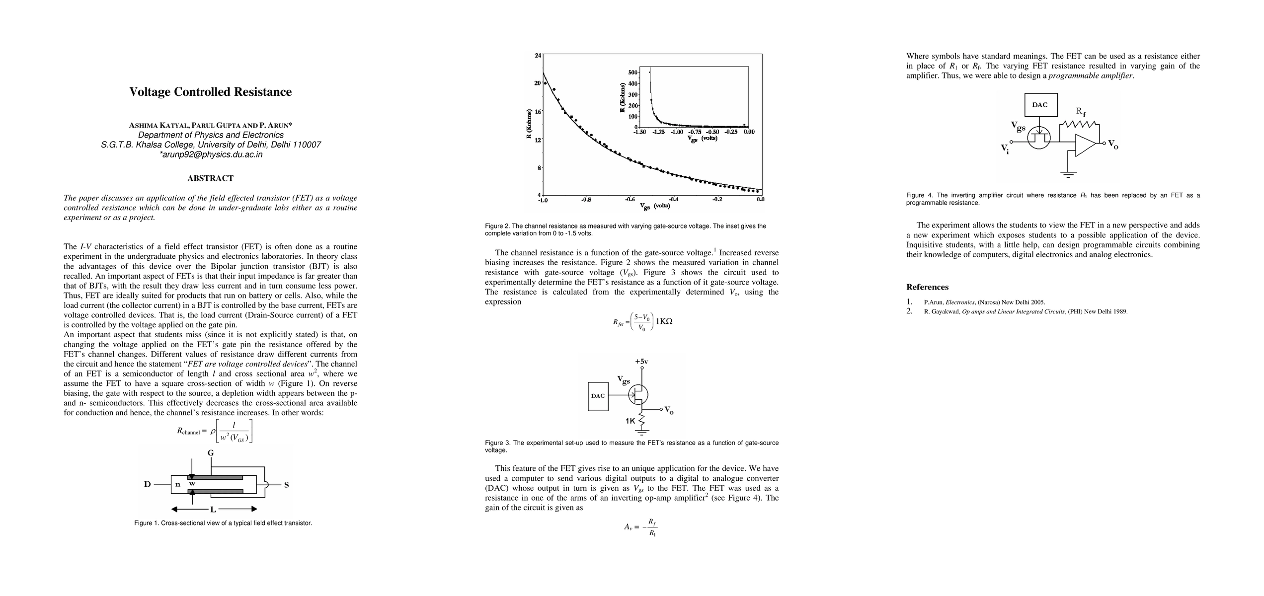 Summary: This paper explores the use of a field-effect transistor (FET) as a voltage-controlled resistance, suitable for undergraduate lab experiments or projects, demonstrating its practical application in resistance control.