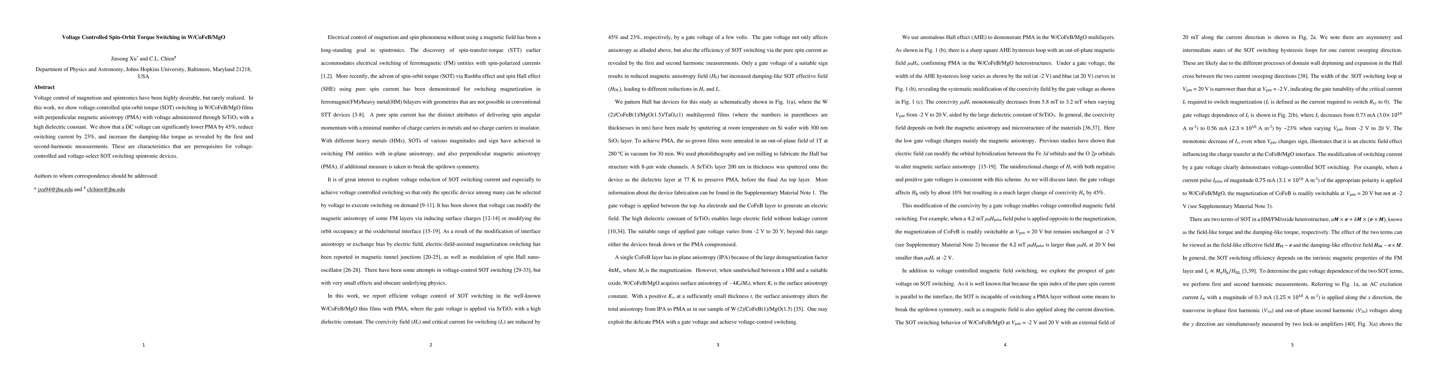 The paper presents a method for voltage-controlled spin-orbit torque switching in W/CoFeB/MgO films, utilizing SrTiO3 for high dielectric constant, and demonstrates modifications in magnetic anisotropy and damping-like SOT effective field.
