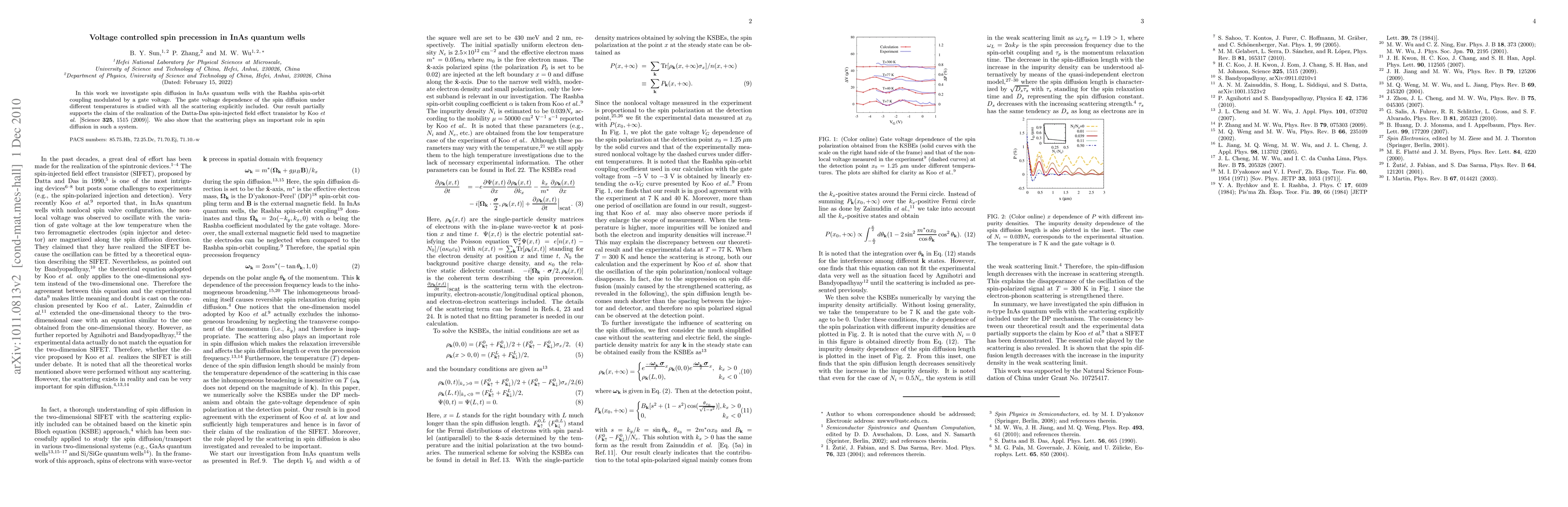 This paper investigates spin diffusion in InAs quantum wells under gate voltage modulation, finding that scattering significantly impacts spin diffusion and partially supports the Datta-Das spin-injected field effect transistor model proposed by Koo et al. The study includes detailed temperature-dependent analyses of spin-orbit coupling.