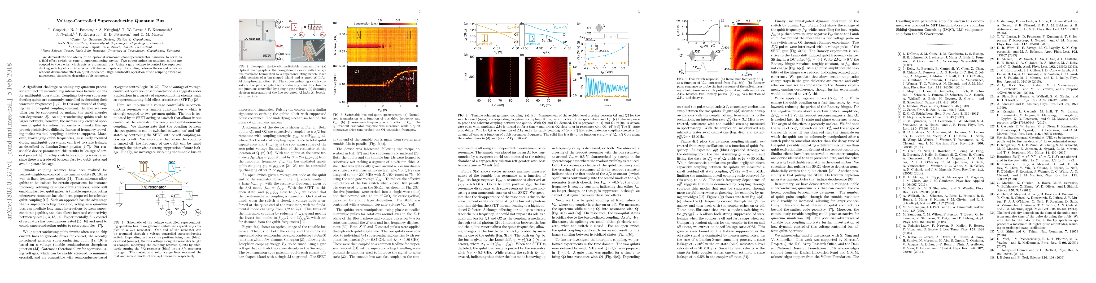 This paper demonstrates a voltage-controlled superconducting quantum bus using an epitaxial semiconductor-superconductor nanowire to tune a superconducting cavity, enabling up to an 8-fold change in qubit-qubit coupling without affecting qubit coherence. However, high-bandwidth operation degrades qubit coherence.