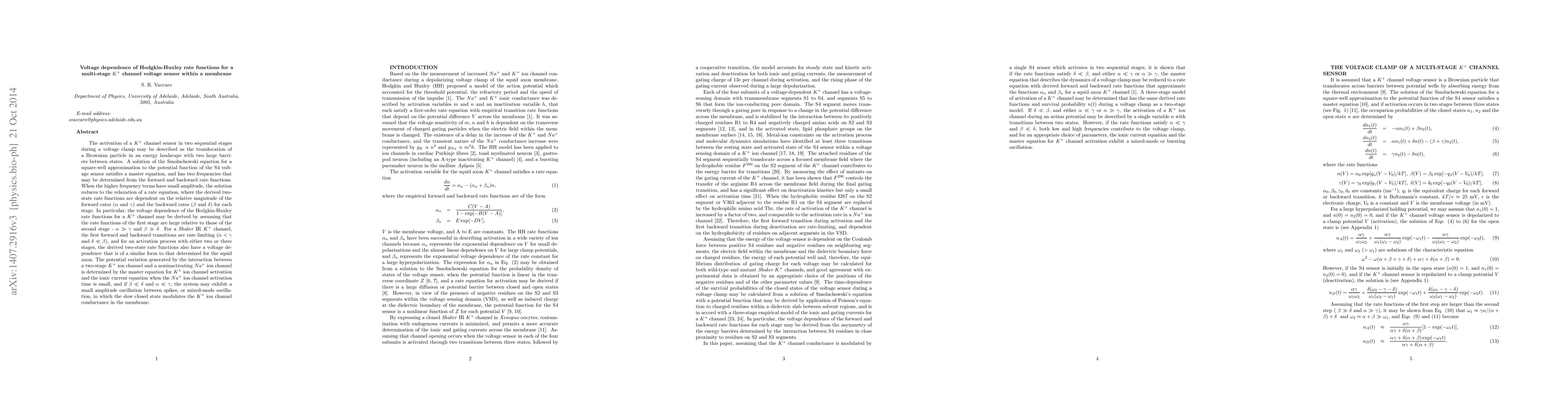 This paper investigates the voltage dependence of Hodgkin-Huxley rate functions for a multi-stage K+ channel voltage sensor, deriving two-state rate functions from the Smoluchowski equation for a square-well potential function. It shows that the voltage dependence is determined by the relative magnitudes of the forward and backward rate functions, particularly for the Shaker IR K+ channel.