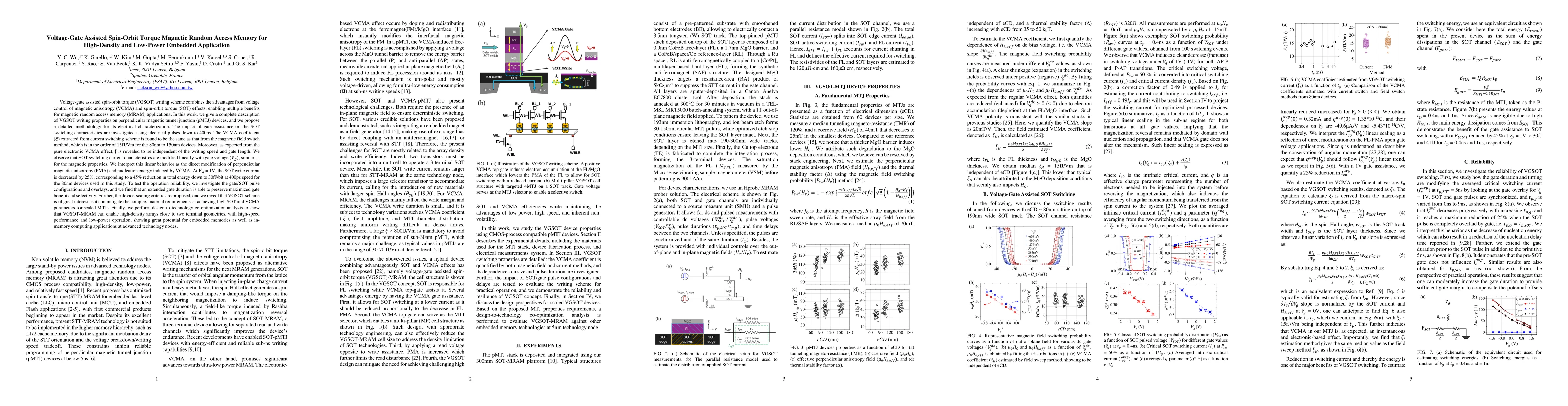 This paper explores a voltage-gate assisted spin-orbit torque (VGSOT) writing scheme for magnetic random access memory (MRAM) that combines voltage control of magnetic anisotropy (VCMA) and spin-orbit torque (SOT) effects. The study reveals a 25% reduction in SOT write current and a 45% reduction in energy consumption at 400ps speed, demonstrating the potential for high-density, low-power, and high-speed MRAM suitable for embedded applications.