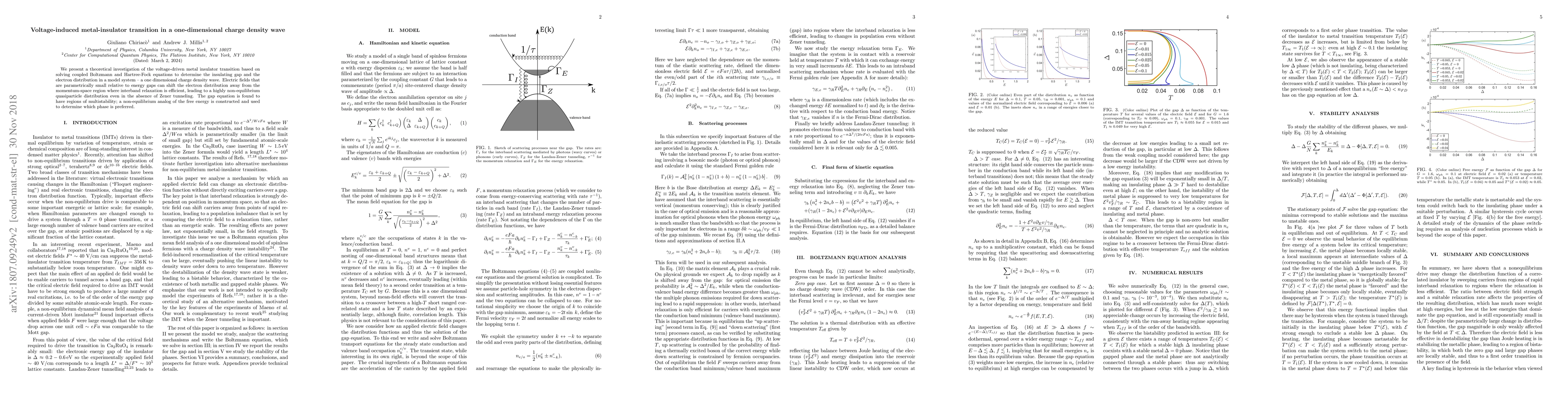 This paper investigates the metal-insulator transition in a one-dimensional charge density wave induced by voltage, using coupled Boltzmann and Hartree-Fock equations. Small electric fields can create a non-equilibrium quasiparticle distribution, leading to a voltage-driven transition and regions of multistability in the insulating gap.