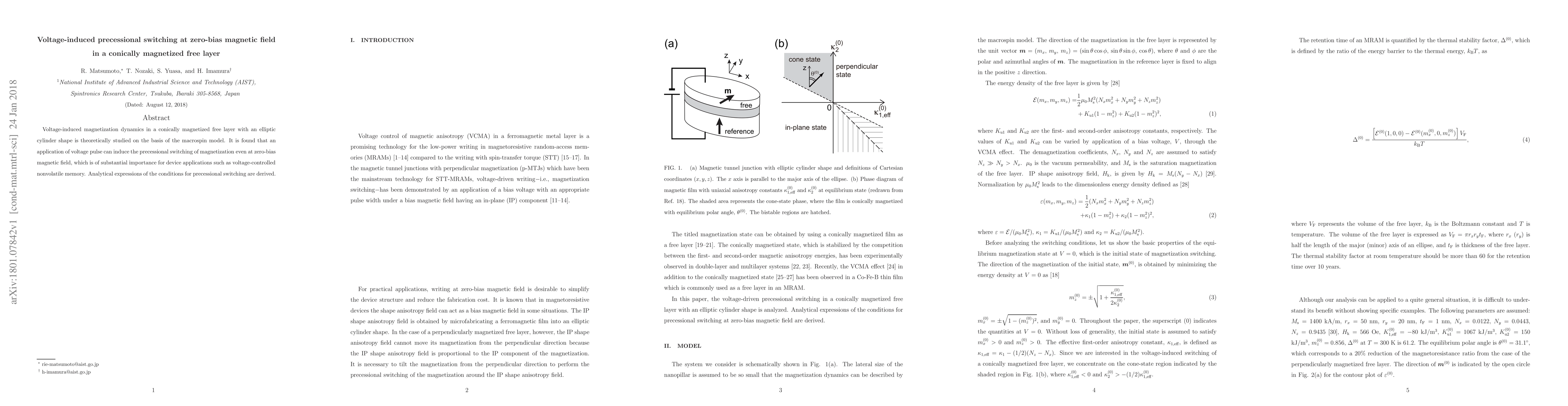 This paper explores voltage-induced magnetization dynamics in a conically magnetized free layer, revealing that voltage pulses can induce precessional switching even without an external magnetic field. Analytical expressions for the conditions enabling this phenomenon are derived, highlighting its potential for voltage-controlled nonvolatile memory devices.