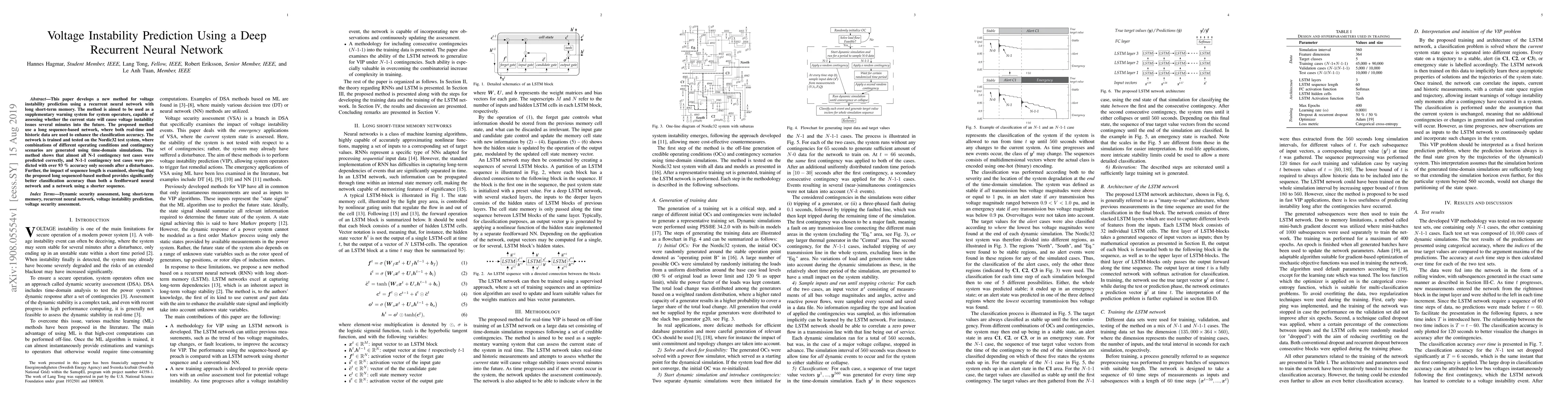 This paper introduces a deep recurrent neural network with long short-term memory for predicting voltage instability, achieving high accuracy in N-1 and N-1-1 contingency tests. The method outperforms feedforward networks and shorter sequences, demonstrating improved classification accuracy.