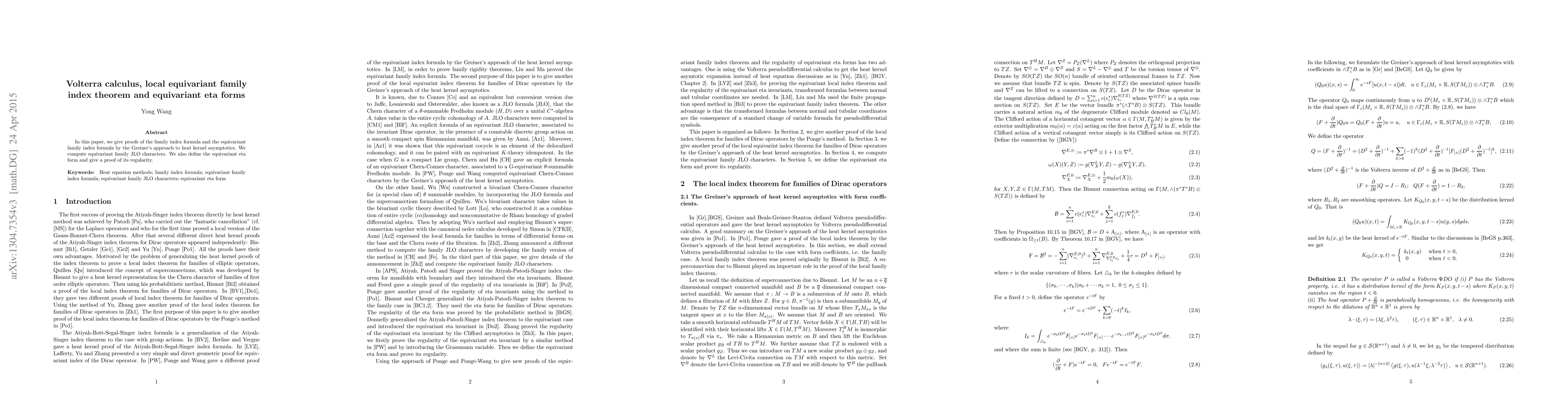 This paper proves the family index and equivariant family index formulas using Greiner's heat kernel asymptotics approach, computes equivariant family JLO characters, and defines and proves the regularity of equivariant eta forms.