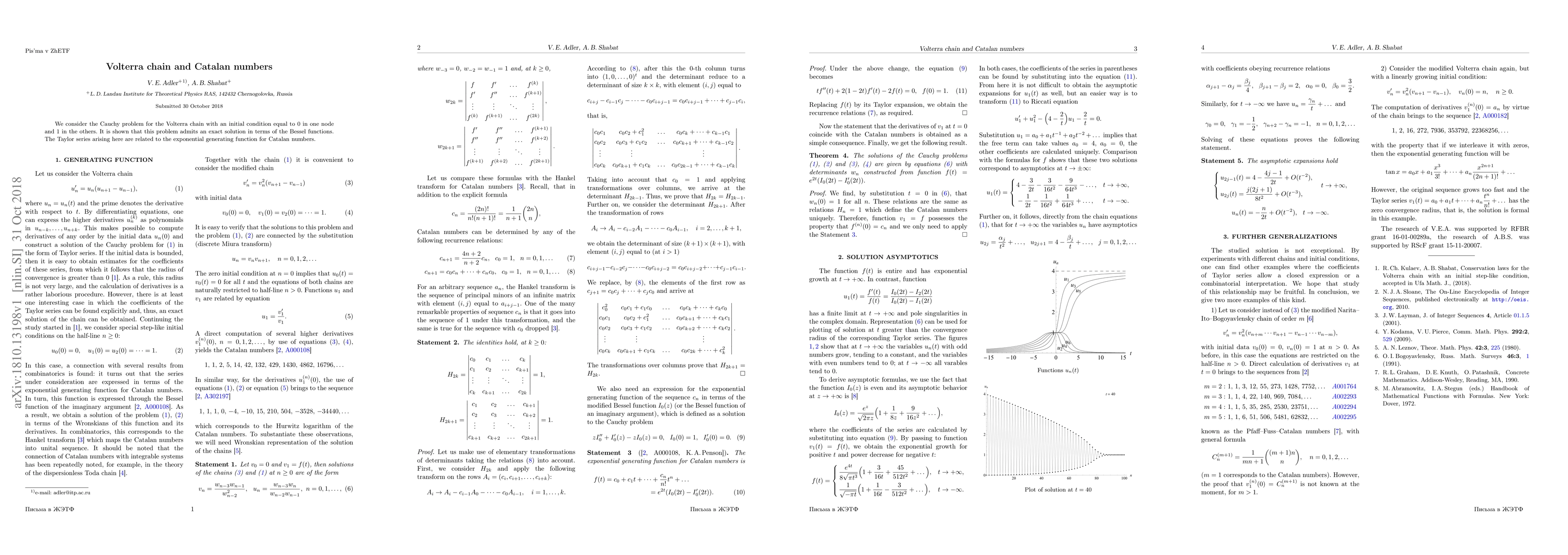 We consider the Cauchy problem for the Volterra chain with an initial condition equal to 0 in one node and 1 in the others. It is shown that this problem admits an exact solution in terms of the Bessel functions. The Taylor series arising here are related to the exponential generating function for Catalan numbers.