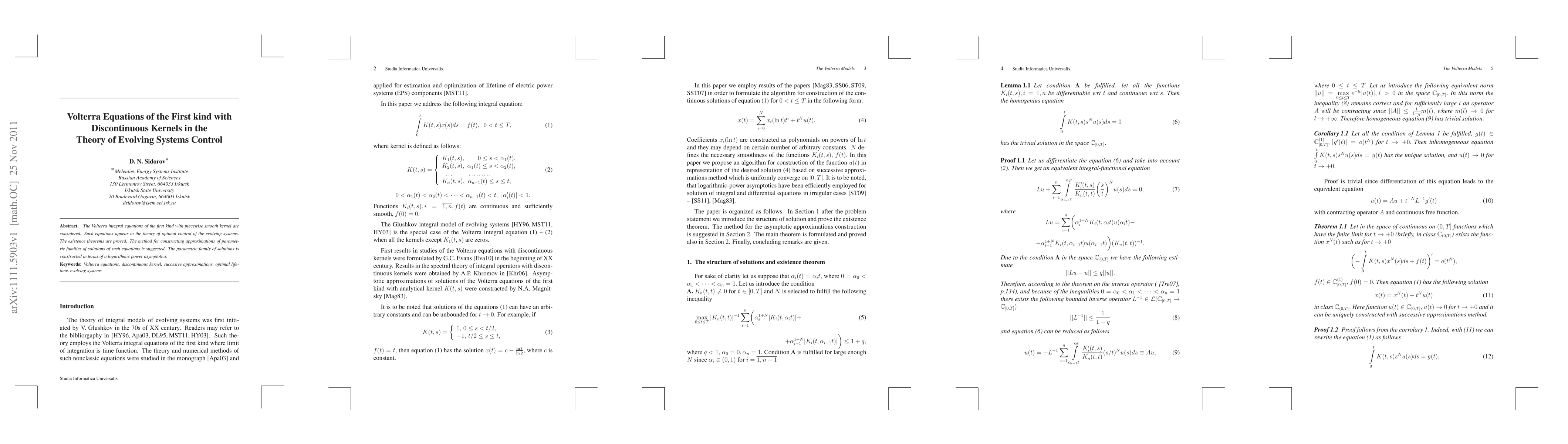 This paper investigates the Volterra equations of the first kind with piecewise smooth kernels in the context of evolving systems control, establishing existence theorems and suggesting a method for constructing approximations of parametric families of solutions.