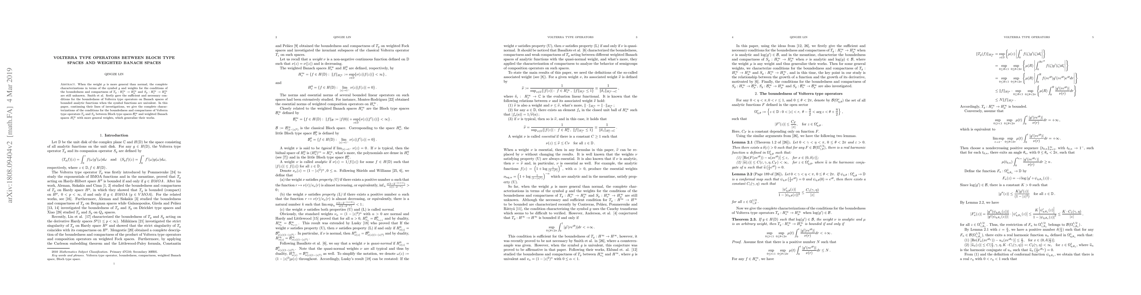 When the weight $\mu$ is more general than normal, the complete characterizations in terms of the symbol $g$ and weights for the conditions of the boundedness and compactness of $T_g: H^{\infty}_\nu\rightarrow H^{\infty}_\mu$ and $S_g: H^{\infty}_\nu\rightarrow H^{\infty}_\mu$ are still unknown. Smith et al. firstly gave the sufficient and necessary conditions for the boundedness of Volterra type operators on Banach spaces of bounded analytic functions when the symbol functions are univalent. In this paper, continuing their lines of investigations, we give the complete characterizations of the conditions for the boundedness and compactness of Volterra type operators $T_g$ and $S_g$ between Bloch type spaces $\mathcal{B}^\infty_\nu$ and weighted Banach spaces $H^{\infty}_\nu$ with more general weights, which generalize their works.