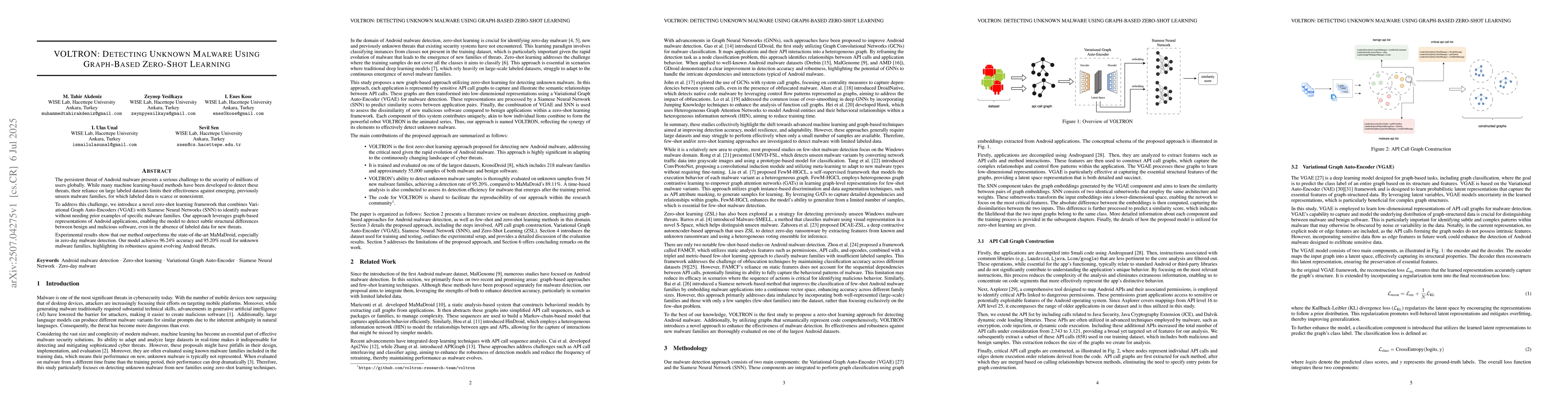 The main technical contribution is the development of VOLTRON, a graph-based malware detection system that combines VGAE and SNN for zero-shot learning, enabling robust classification of malware even without prior examples of specific malware families.