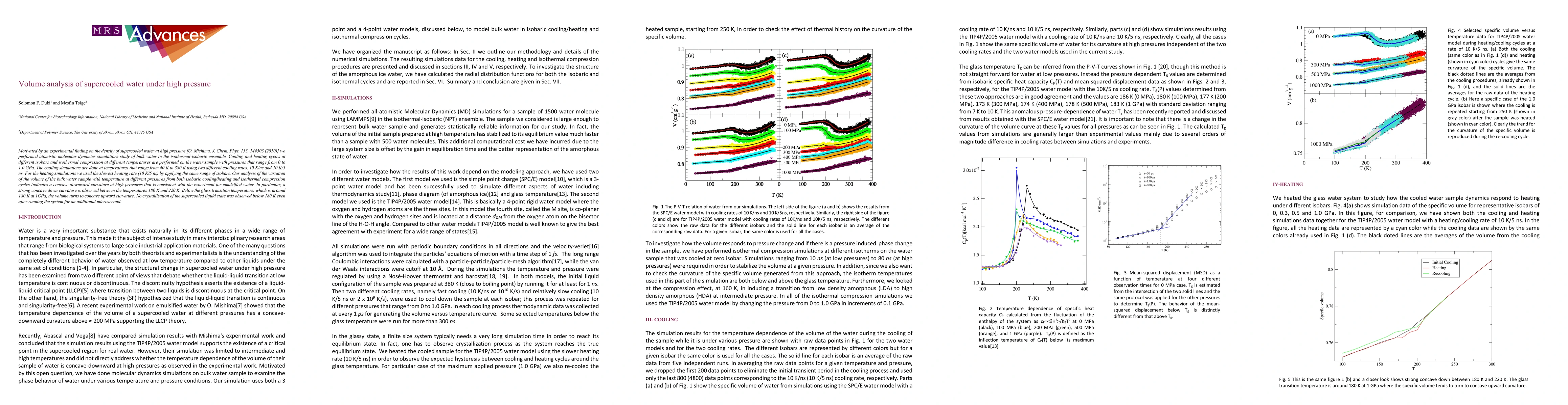 This study uses molecular dynamics simulations to analyze the volume behavior of supercooled water under high pressure, revealing a concave-downward curvature in volume-temperature plots at pressures up to 1.0 GPa, particularly between 180 K and 220 K, consistent with experimental findings. Below the glass transition temperature of around 180 K, the volume shows a concave-upward trend, and no crystallization occurs.