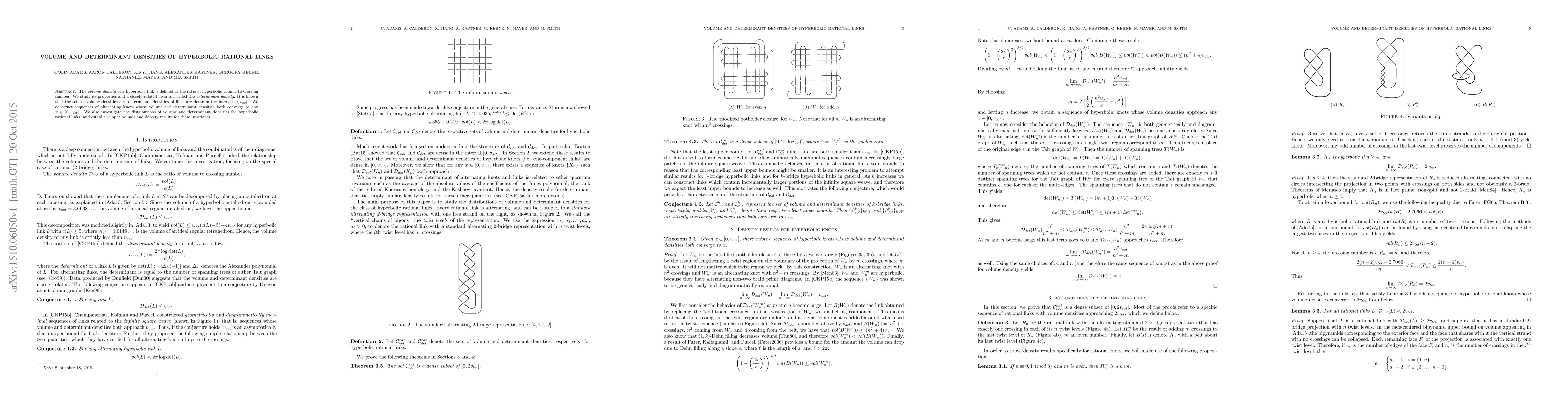 This paper investigates the volume density and determinant density of hyperbolic rational links, demonstrating that both sets are dense in the interval [0, v_oct]. The authors construct sequences of alternating knots converging to any density value in this interval and establish upper bounds and density results for these invariants.