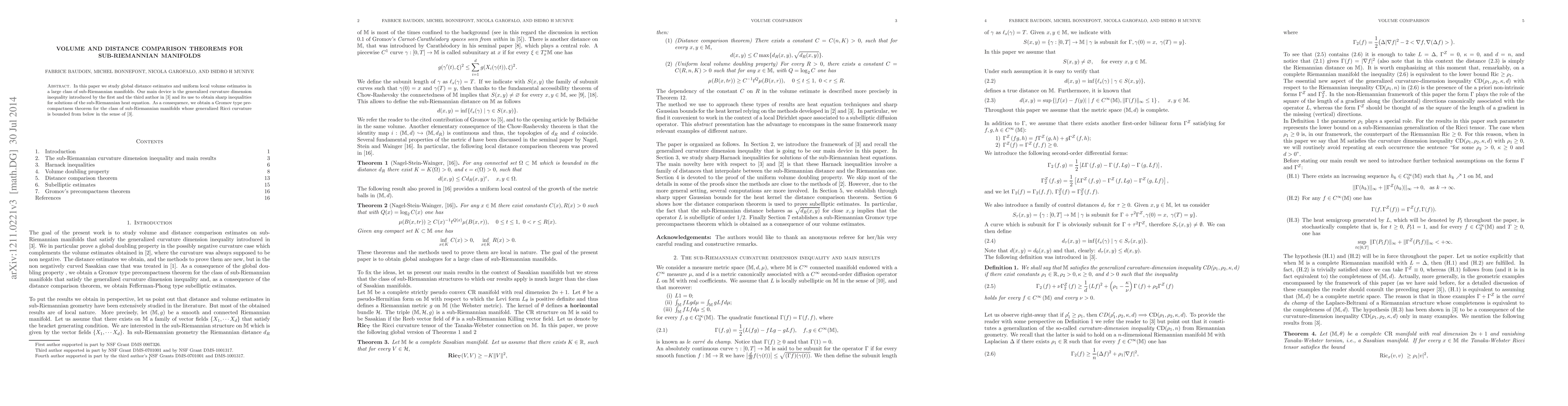 This paper explores global distance and local volume estimates in sub-Riemannian manifolds using a generalized curvature-dimension inequality, leading to a Gromov-type precompactness theorem for manifolds with bounded generalized Ricci curvature.