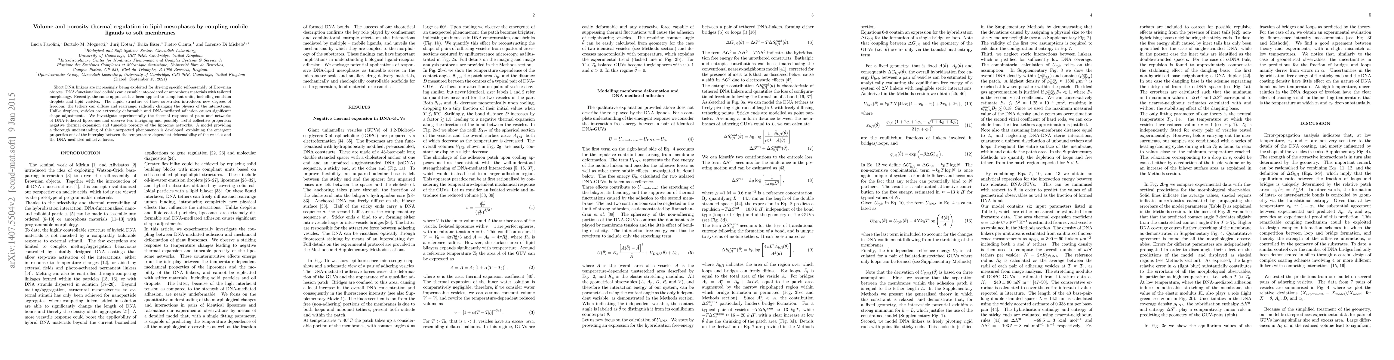 This paper explores the thermal regulation of lipid mesophases by coupling mobile DNA linkers to deformable liposomes, revealing negative thermal expansion and tunable porosity in liposome networks due to the interplay between temperature-dependent vesicle deformability and DNA-mediated adhesion. The study develops a model to explain these emergent collective properties.