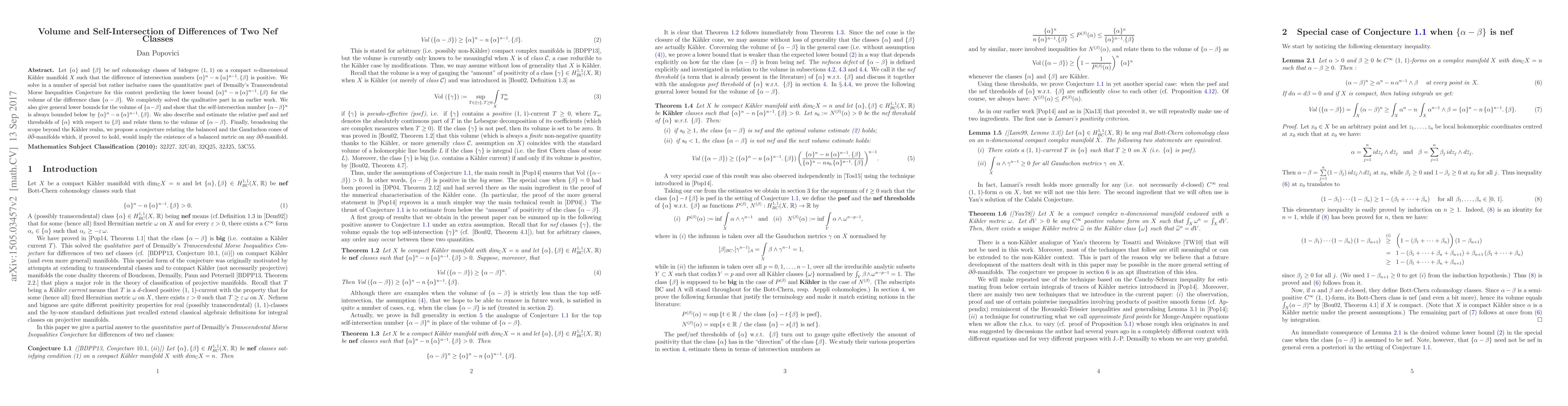 Let $\{\alpha\}$ and $\{\beta\}$ be nef cohomology classes of bidegree $(1,\,1)$ on a compact $n$-dimensional K\"ahler manifold $X$ such that the difference of intersection numbers $\{\alpha\}^n - n\,\{\alpha\}^{n-1}.\,\{\beta\}$ is positive. We solve in a number of special but rather inclusive cases the quantitative part of Demailly's Transcendental Morse Inequalities Conjecture for this context predicting the lower bound $\{\alpha\}^n-n\,\{\alpha\}^{n-1}.\,\{\beta\}$ for the volume of the difference class $\{\alpha-\beta\}$. We completely solved the qualitative part in an earlier work. We also give general lower bounds for the volume of $\{\alpha-\beta\}$ and show that the self-intersection number $\{\alpha-\beta\}^n$ is always bounded below by $\{\alpha\}^n-n\,\{\alpha\}^{n-1}.\,\{\beta\}$. We also describe and estimate the relative psef and nef thresholds of $\{\alpha\}$ with respect to $\{\beta\}$ and relate them to the volume of $\{\alpha-\beta\}$. Finally, broadening the scope beyond the K\"ahler realm, we propose a conjecture relating the balanced and the Gauduchon cones of $\partial\bar\partial$-manifolds which, if proved to hold true, would imply the existence of a balanced metric on any $\partial\bar\partial$-manifold.