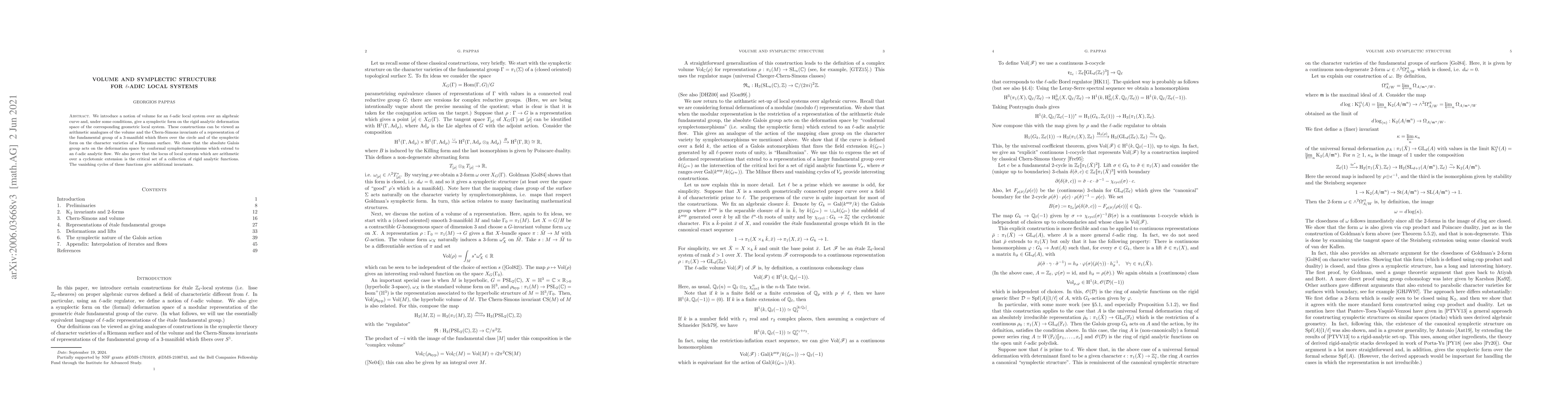 We introduce a notion of volume for an l-adic local system over an algebraic curve and, under some conditions, give a symplectic form on the rigid analytic deformation space of the corresponding geometric local system. These constructions can be viewed as arithmetic analogues of the volume and the Chern-Simons invariants of a representation of the fundamental group of a 3-manifold which fibers over the circle and of the symplectic form on the character varieties of a Riemann surface. We show that the absolute Galois group acts on the deformation space by conformal symplectomorphisms which extend to an l-adic analytic flow. We also prove that the locus of the deformation space over which the local system suitably descends is the critical set of a collection of rigid analytic functions. The vanishing cycles of these functions give additional invariants.