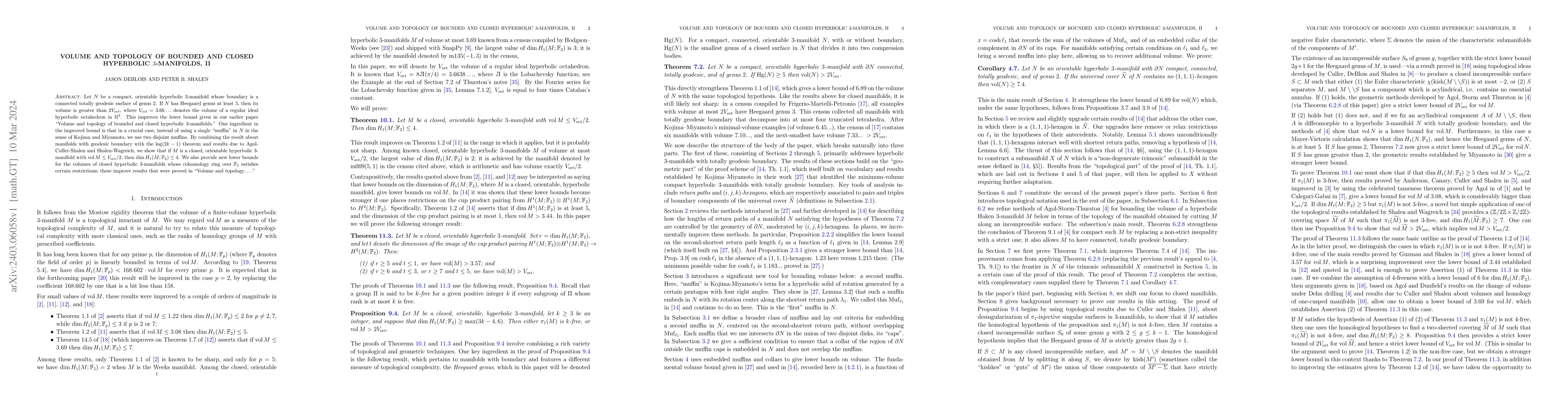 Let $N$ be a compact, orientable hyperbolic 3-manifold whose boundary is a connected totally geodesic surface of genus $2$. If $N$ has Heegaard genus at least $5$, then its volume is greater than $2V_{\rm oct}$, where $V_{\rm oct}=3.66\ldots$ denotes the volume of a regular ideal hyperbolic octahedron in $\mathbb{H}^3$. This improves the lower bound given in our earlier paper ``Volume and topology of bounded and closed hyperbolic $3$-manifolds.'' One ingredient in the improved bound is that in a crucial case, instead of using a single ``muffin'' in $N$ in the sense of Kojima and Miyamoto, we use two disjoint muffins. By combining the result about manifolds with geodesic boundary with the $\log(2k-1)$ theorem and results due to Agol-Culler-Shalen and Shalen-Wagreich, we show that if $M$ is a closed, orientable hyperbolic $3$-manifold with $\mathop{\rm vol} M\le V_{\rm oct}/2$, then $\dim H_1(M;\mathbb{F}_2)\le4$. We also provide new lower bounds for the volumes of closed hyperbolic $3$-manifolds whose cohomology ring over $\mathbb{F}_2$ satisfies certain restrictions; these improve results that were proved in ``Volume and topology$\ldots$.''