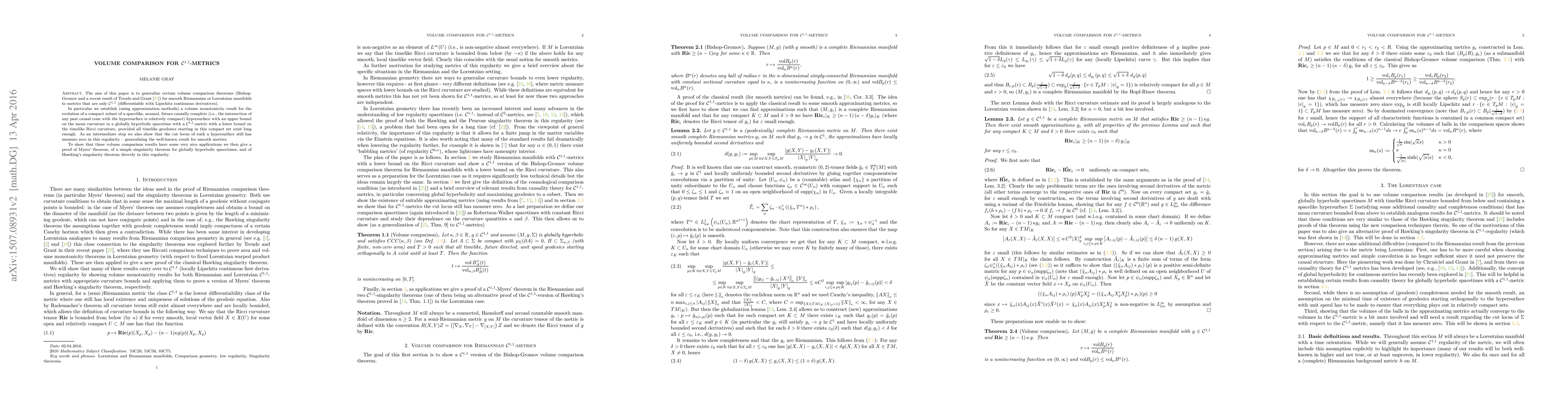 This paper establishes volume comparison results for balls in $C^{1,1}$ Riemannian manifolds with Ricci curvature bounds and for evolving hypersurfaces in $C^{1,1}$ spacetimes with mean curvature bounds. The results are used to prove Myers' and Hawking's theorems under these regularity conditions.