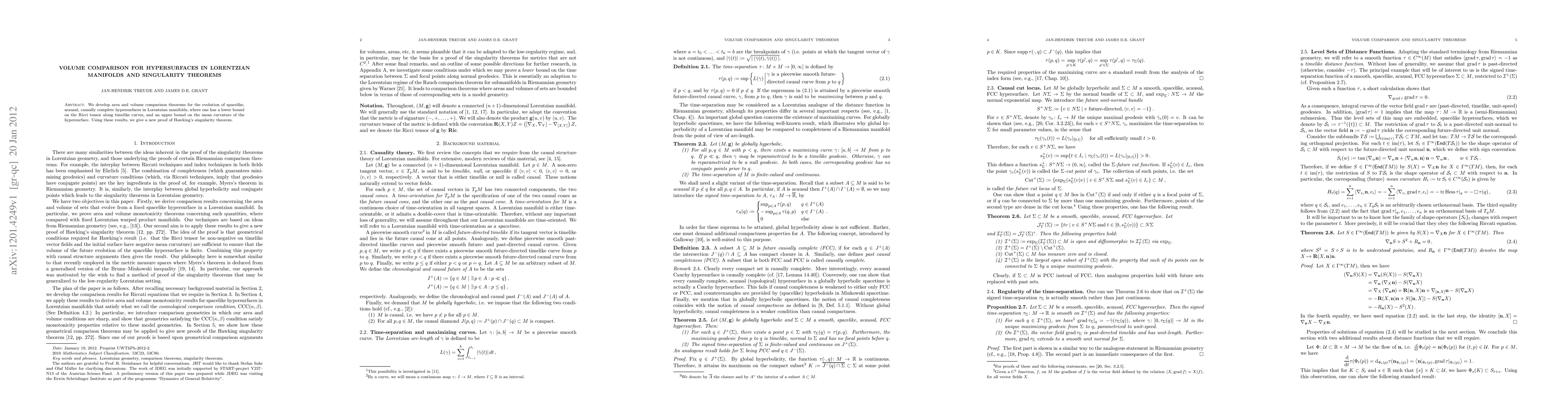 The paper establishes volume and area comparison theorems for hypersurfaces in Lorentzian manifolds under Ricci and mean curvature bounds, and utilizes these theorems to provide a novel proof of Hawking's singularity theorem.