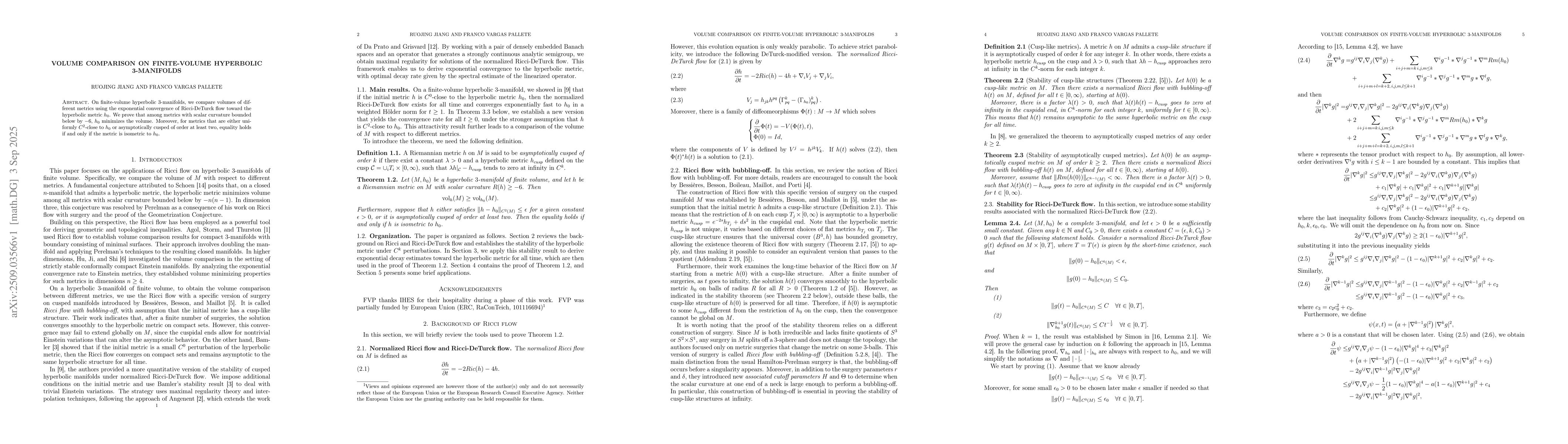On finite-volume hyperbolic $3$-manifolds, we compare volumes of different metrics using the exponential convergence of Ricci-DeTurck flow toward the hyperbolic metric $h_0$. We prove that among metrics with scalar curvature bounded below by $-6$, $h_0$ minimizes the volume. Moreover, for metrics that are either uniformly $C^2$-close to $h_0$ or asymptotically cusped of order at least two, equality holds if and only if the metric is isometric to $h_0$.