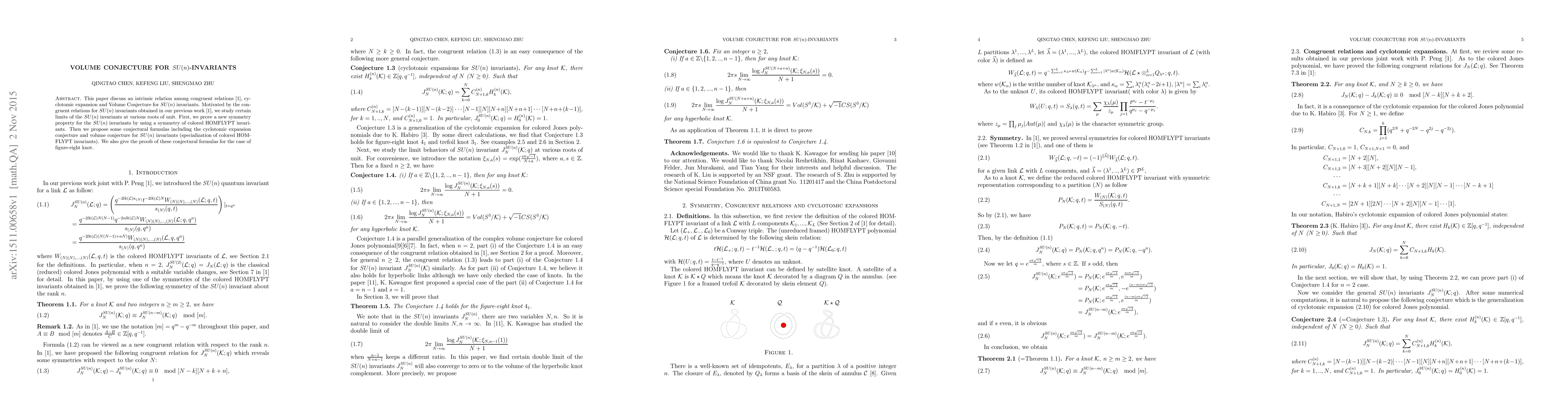 This paper discuss an intrinsic relation among congruent relations \cite{CLPZ}, cyclotomic expansion and Volume Conjecture for $SU(n)$ invariants. Motivated by the congruent relations for $SU(n)$ invariants obtained in our previous work \cite{CLPZ}, we study certain limits of the $SU(n)$ invariants at various roots of unit. First, we prove a new symmetry property for the $SU(n)$ invariants by using a symmetry of colored HOMFLYPT invariants. Then we propose some conjectural formulas including the cyclotomic expansion conjecture and volume conjecture for $SU(n)$ invariants (specialization of colored HOMFLYPT invariants). We also give the proofs of these conjectural formulas for the case of figure-eight knot.