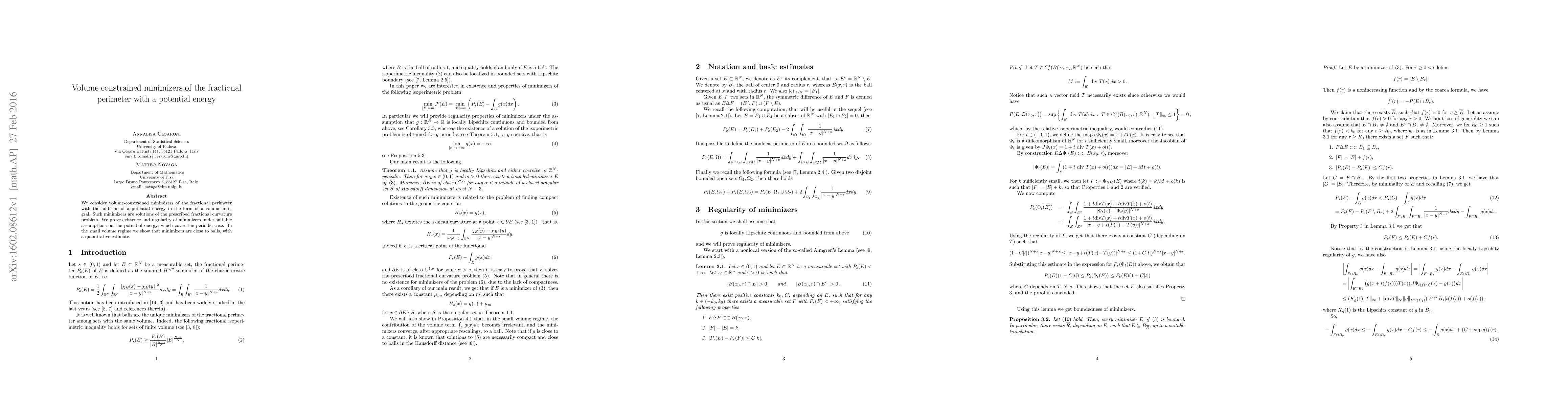 This paper investigates volume-constrained minimizers of fractional perimeter with an added potential energy, proving their existence and regularity under specific conditions. It also demonstrates that in the small volume regime, these minimizers closely resemble balls, with a precise quantitative estimate.