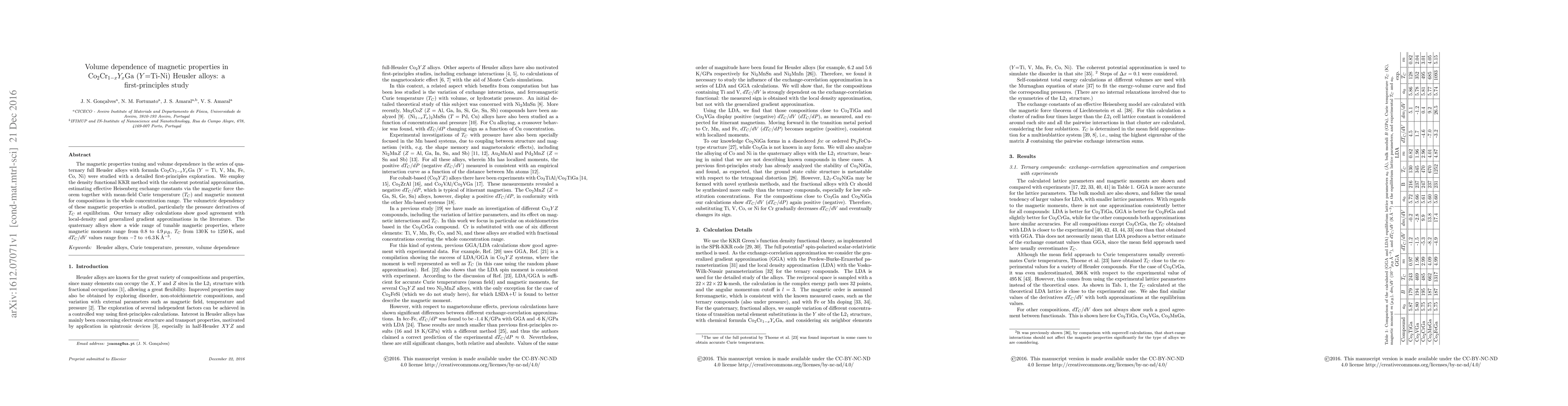 The magnetic properties tuning and volume dependence in the series of quaternary full Heusler alloys with formula Co2Cr1-xYGa (Y = Ti, V, Mn, Fe, Co, Ni) were studied with a detailed first-principles exploration. We employ the density functional KKR method with the coherent potential approximation, estimating effective Heisenberg exchange constants via the magnetic force theorem together with mean-field Curie temperature (TC) and magnetic moment for compositions in the whole concentration range. The volumetric dependency of these magnetic properties is studied, particularly the pressure derivatives of TC at equilibrium. Our ternary alloy calculations show good agreement with local-density and generalized gradient approximations in the literature. The quaternary alloys show a wide range of tunable magnetic properties, where magnetic moments range from 0.8 to 4.9 mu_B, TC from 130 K to 1250 K, and dTC/dV values range from -7 to +6.3 K A-3.