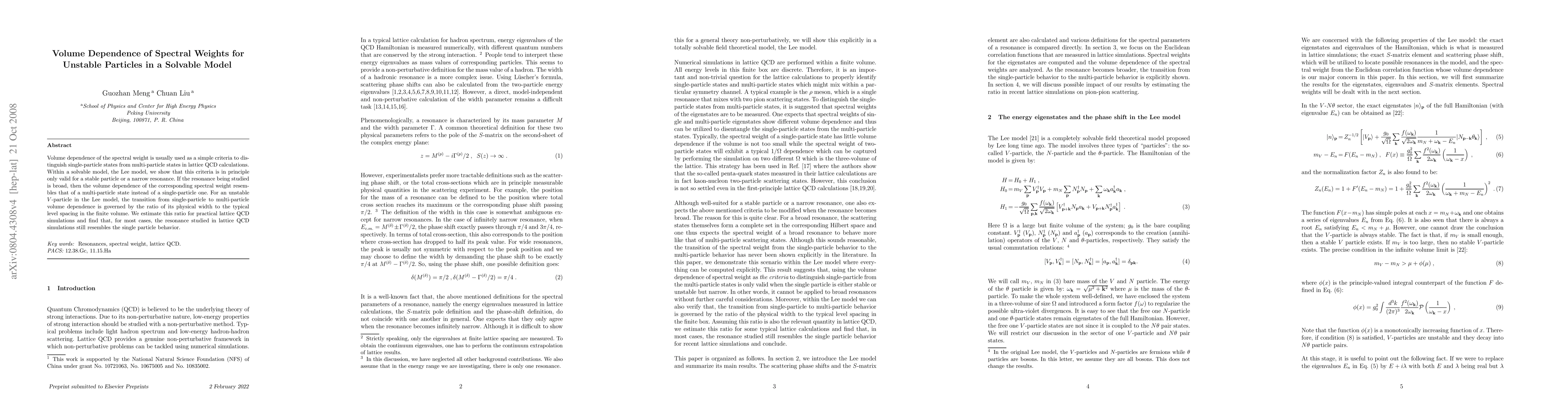 Volume dependence of the spectral weight is usually used as a simple criteria to distinguish single-particle states from multi-particle states in lattice QCD calculations. Within a solvable model, the Lee model, we show that this criteria is in principle only valid for a stable particle or a narrow resonance. If the resonance being studied is broad, then the volume dependence of the corresponding spectral weight resembles that of a multi-particle state instead of a single-particle one. For an unstable $V$-particle in the Lee model, the transition from single-particle to multi-particle volume dependence is governed by the ratio of its physical width to the typical level spacing in the finite volume. We estimate this ratio for practical lattice QCD simulations and find that, for most cases, the resonance studied in lattice QCD simulations still resembles the single particle behavior.