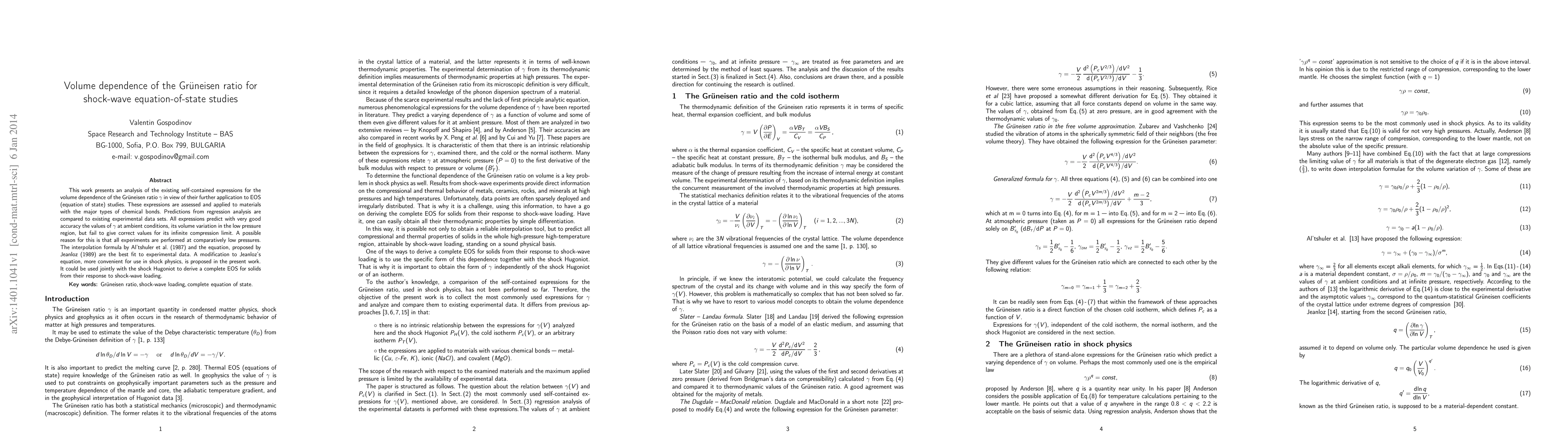 This paper analyzes expressions for the volume dependence of the Grüneisen ratio $\gamma$ for equation of state studies, finding that the interpolation formula by Al'tshuler et al. (1987) and Jeanloz's equation (1989) best match experimental data, though they fail at high pressures. The study proposes a modified version of Jeanloz's equation for better shock-wave applications.