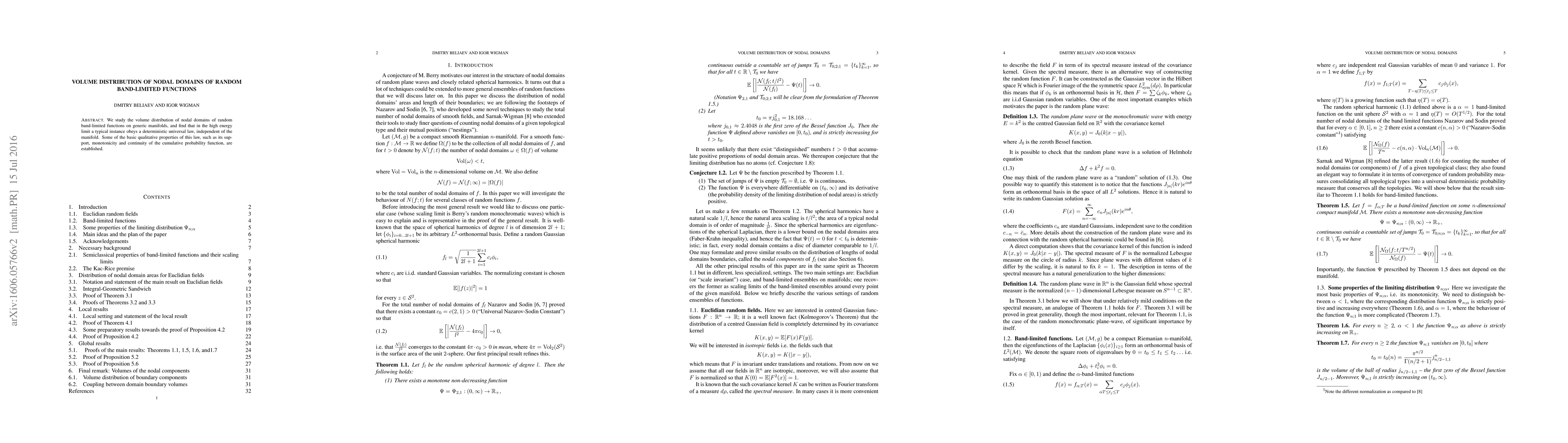 This paper investigates the volume distribution of nodal domains in random band-limited functions on various manifolds, revealing a deterministic universal law in the high energy limit that is independent of the manifold. Key properties of this law, such as support, monotonicity, and continuity, are established.