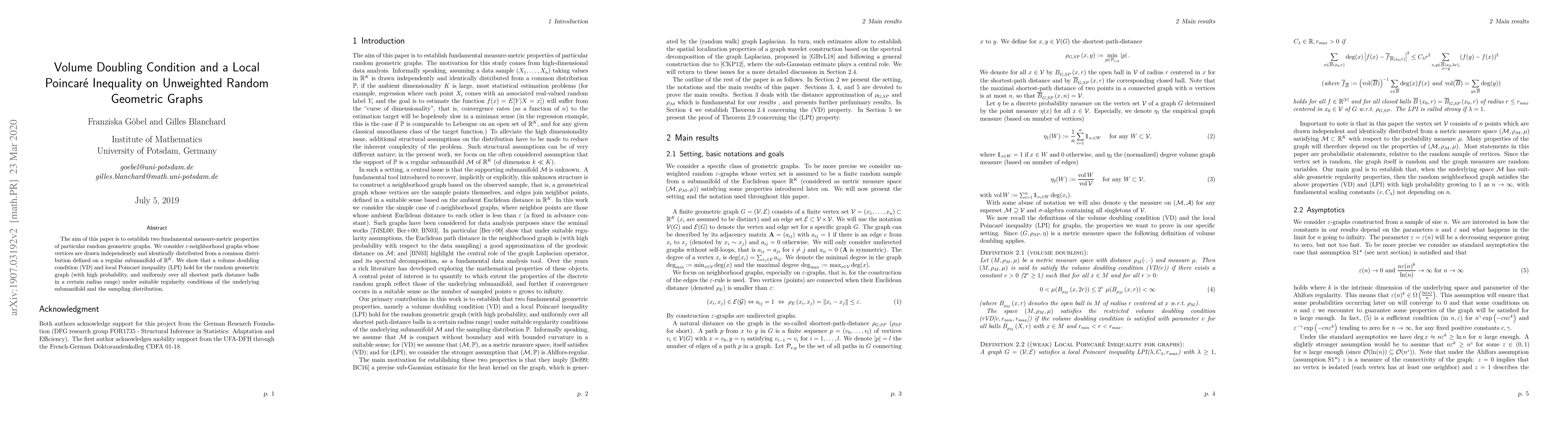 The aim of this paper is to establish two fundamental measure-metric properties of particular random geometric graphs. We consider $\varepsilon$-neighborhood graphs whose vertices are drawn independently and identically distributed from a common distribution defined on a regular submanifold of $\mathbb{R}^K$. We show that a volume doubling condition (VD) and local Poincar\'e inequality (LPI) hold for the random geometric graph (with high probability, and uniformly over all shortest path distance balls in a certain radius range) under suitable regularity conditions of the underlying submanifold and the sampling distribution.