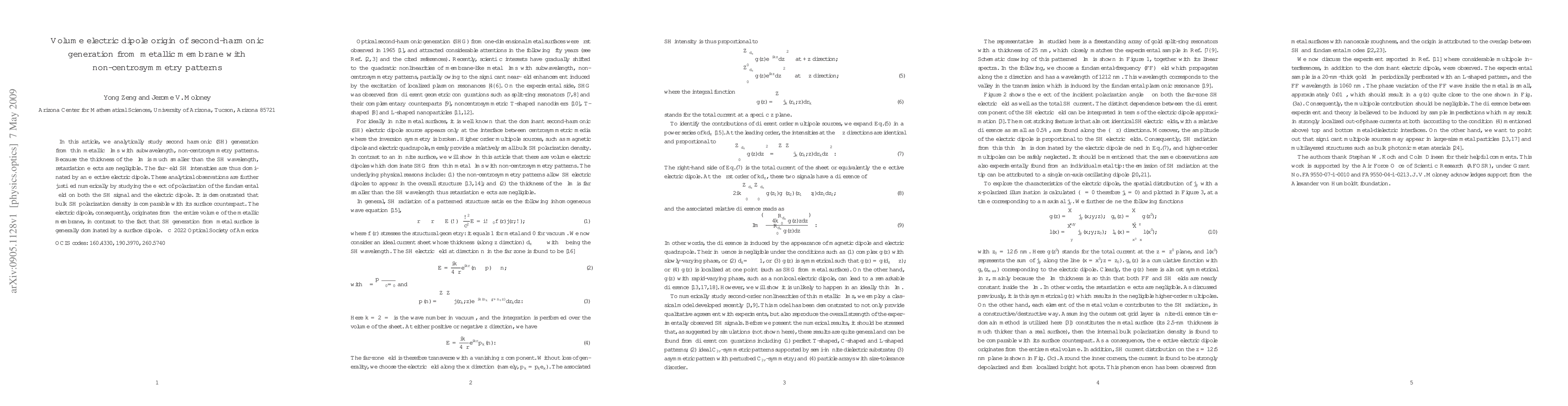 This paper analytically investigates second-harmonic generation (SHG) in thin metallic films with non-centrosymmetric patterns, showing that SH intensity is dominated by an effective electric dipole due to negligible retardation effects. Numerical studies confirm that the bulk polarization density is comparable to surface polarization, indicating that the electric dipole originates from the entire volume of the metallic membrane, contrary to typical surface-dominated SH generation.
