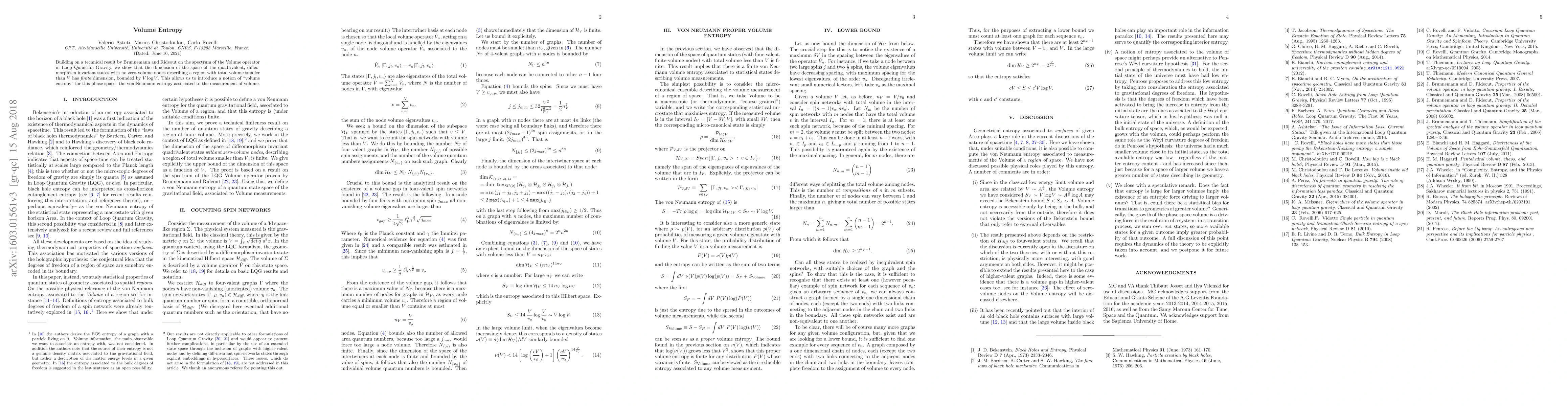 Building on a technical result by Brunnemann and Rideout on the spectrum of the Volume operator in Loop Quantum Gravity, we show that the dimension of the space of the quadrivalent, diffeomorphism invariant states with no zero-volume nodes describing a region with total volume smaller than $V$, has \emph{finite} dimension, bounded by $V \log V$. This allows us to introduce the notion of "volume entropy" for this phase space: the von Neumann entropy associated to the measurement of volume.