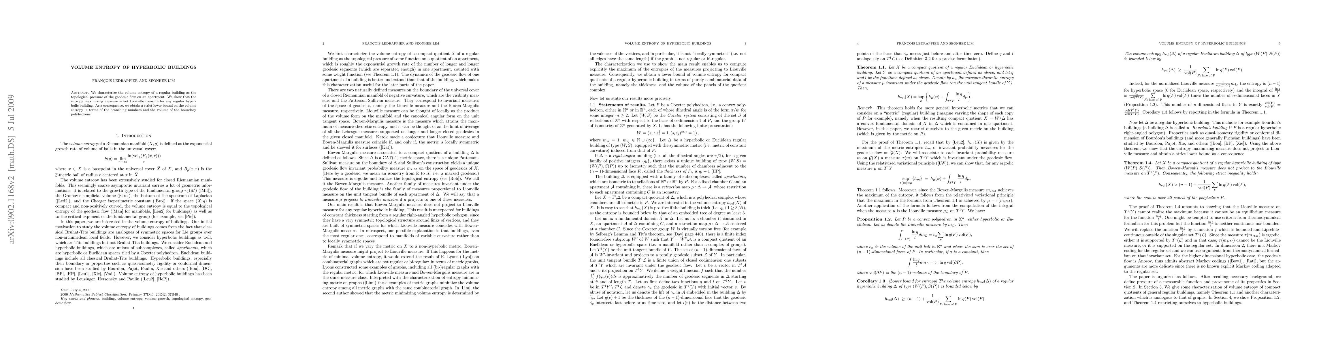 We characterize the volume entropy of an arbitrary regular building as the topological pressure of the geodesic flow on an apartment. We show that the Liouville measure is not entropy maximizing measure for regular hyperbolic buildings. As a consequence, we obtain a strict lower bound on the volume entropy in terms of the branching numbers and the volume of the boundary polyhedrons.