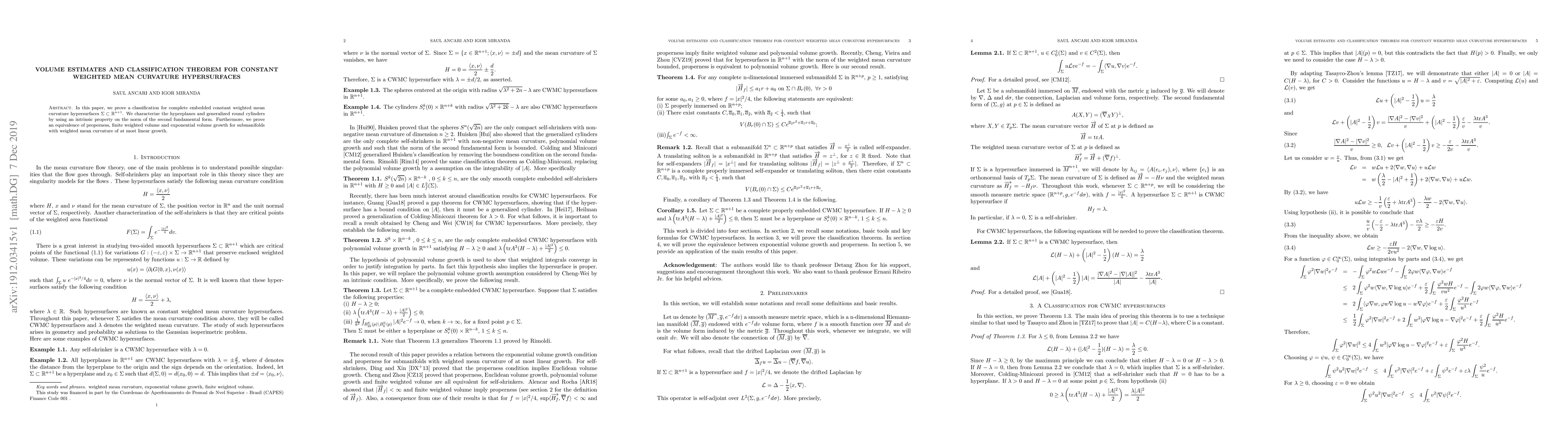 This paper classifies complete embedded hypersurfaces with constant weighted mean curvature, identifying hyperplanes and generalized round cylinders based on the norm of the second fundamental form. It also establishes an equivalence between properness, finite weighted volume, and exponential volume growth for submanifolds with linear growth in weighted mean curvature.
