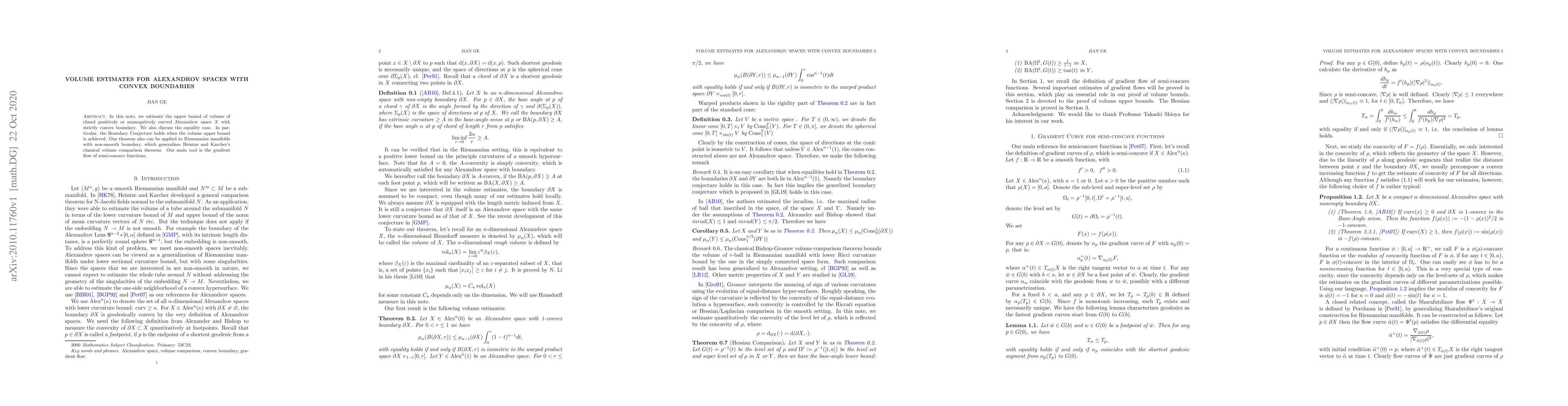 In this note, we estimate the upper bound of volume of closed positively or nonnegatively curved Alexandrov space $X$ with strictly convex boundary. We also discuss the equality case. In particular, the Boundary Conjecture holds when the volume upper bound is achieved. Our theorem also can be applied to Riemannian manifolds with non-smooth boundary, which generalizes Heintze and Karcher's classical volume comparison theorem. Our main tool is the gradient flow of semi-concave functions.