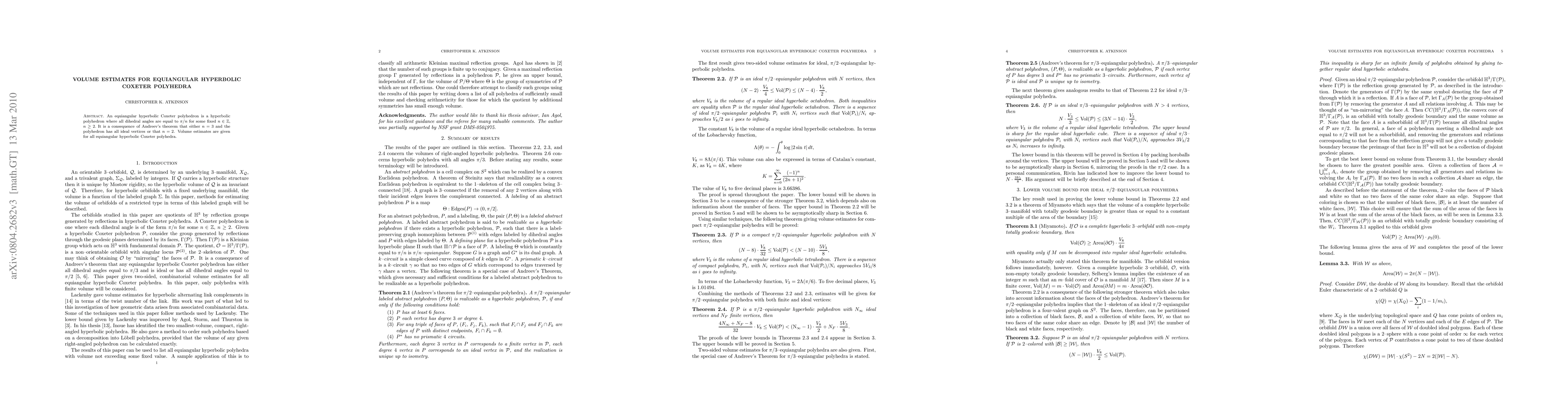 Summary: This paper investigates equiangular hyperbolic Coxeter polyhedra with equal dihedral angles, proving that their volume estimates depend on whether the integer n equals 3 or 2, with a focus on polyhedra having all ideal vertices when n=3.