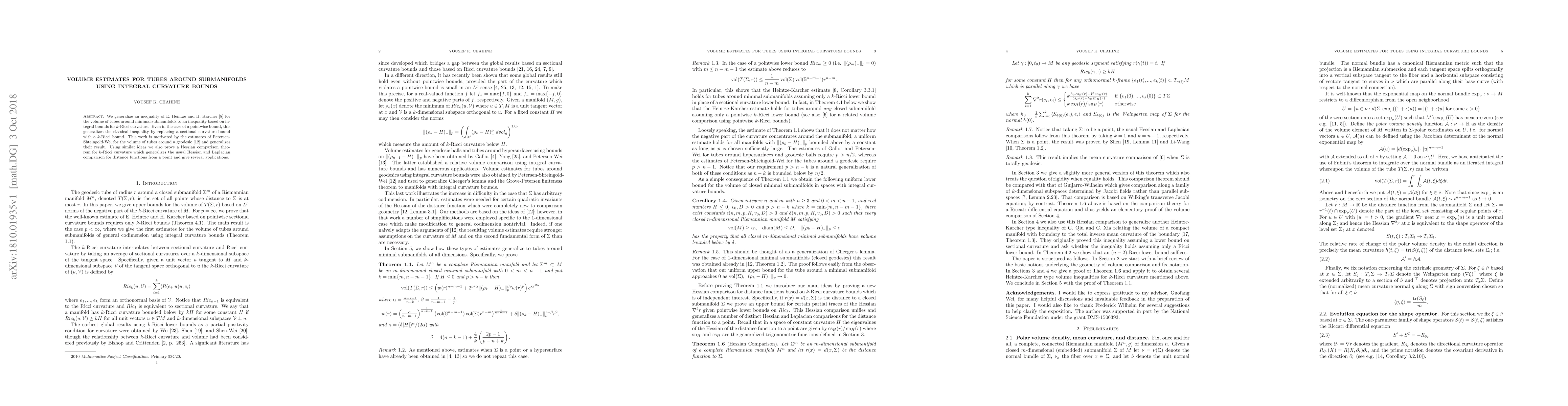 We generalize an inequality of E. Heintze and H. Karcher [8] for the volume of tubes around minimal submanifolds to an inequality based on integral bounds for $k$-Ricci curvature. Even in the case of a pointwise bound, this generalizes the classical inequality by replacing a sectional curvature bound with a $k$-Ricci bound. This work is motivated by the estimates of Petersen-Shteingold-Wei for the volume of tubes around a geodesic [12] and generalizes their result. Using similar ideas we also prove a Hessian comparison theorem for $k$-Ricci curvature which generalizes the usual Hessian and Laplacian comparison for distance functions from a point and give several applications.