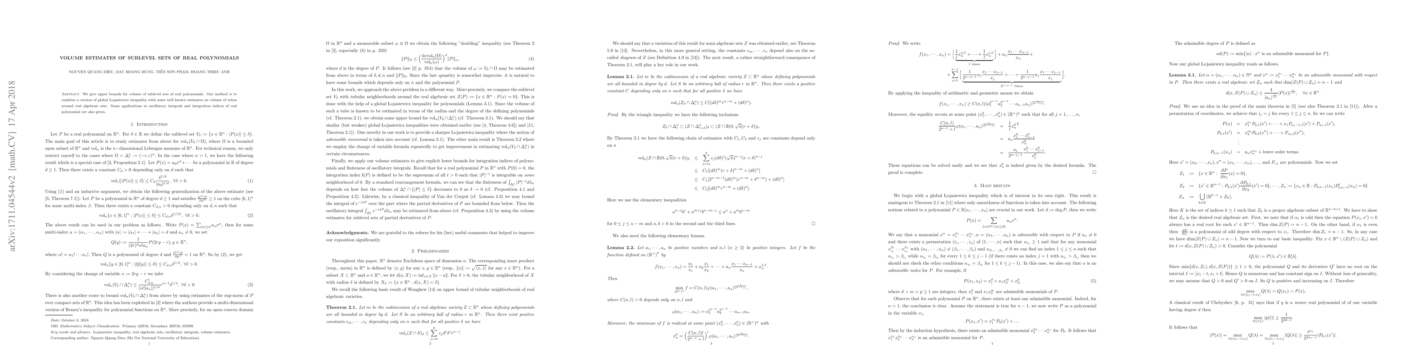 This paper provides upper bounds for the volume of sublevel sets of real polynomials by combining a global Lojasiewicz inequality with volume estimates of tubes around real algebraic sets. It also explores applications to oscillatory integrals and integration indices of real polynomials.