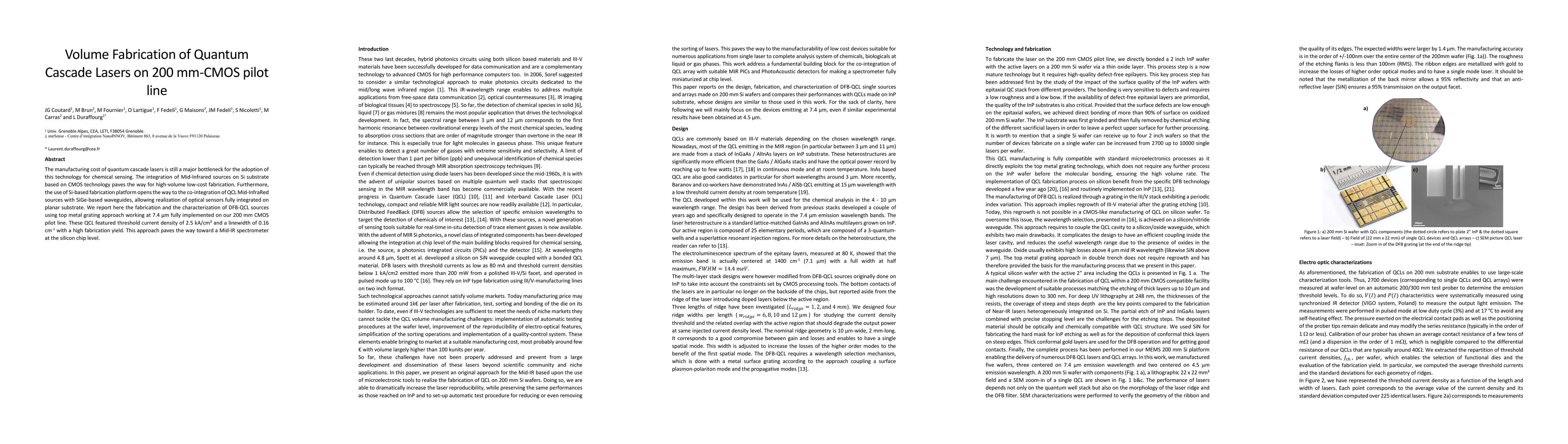 Researchers successfully fabricated quantum cascade lasers on a 200 mm CMOS pilot line, achieving high yields and paving the way for low-cost integration of Mid-Infrared sources on silicon substrates.