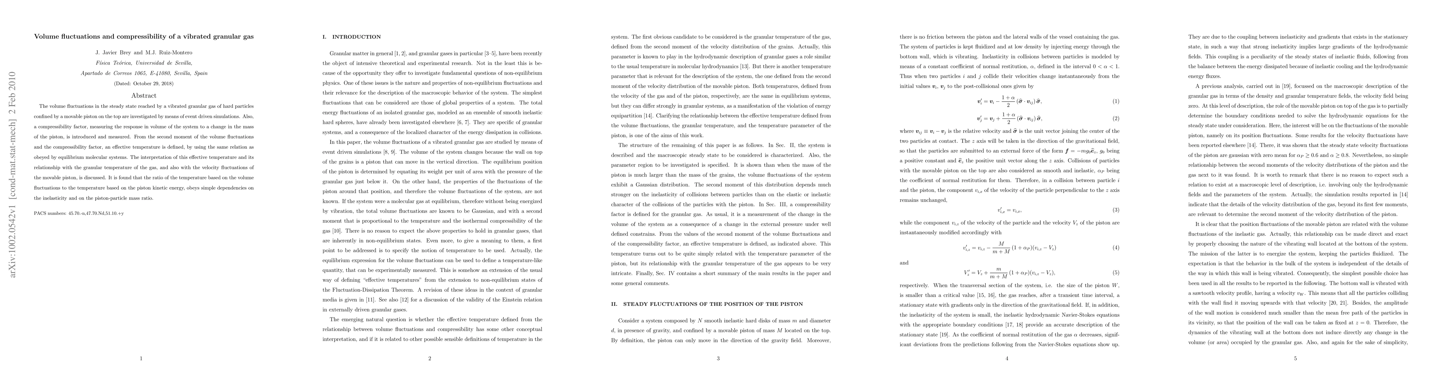 This research uses event-driven simulations to study a vibrated granular gas, finding a compressibility factor and defining an effective temperature. It reveals that this effective temperature, derived from volume fluctuations, relates to the granular temperature and piston kinetic energy, with their ratio depending on inelasticity and piston-particle mass ratio.